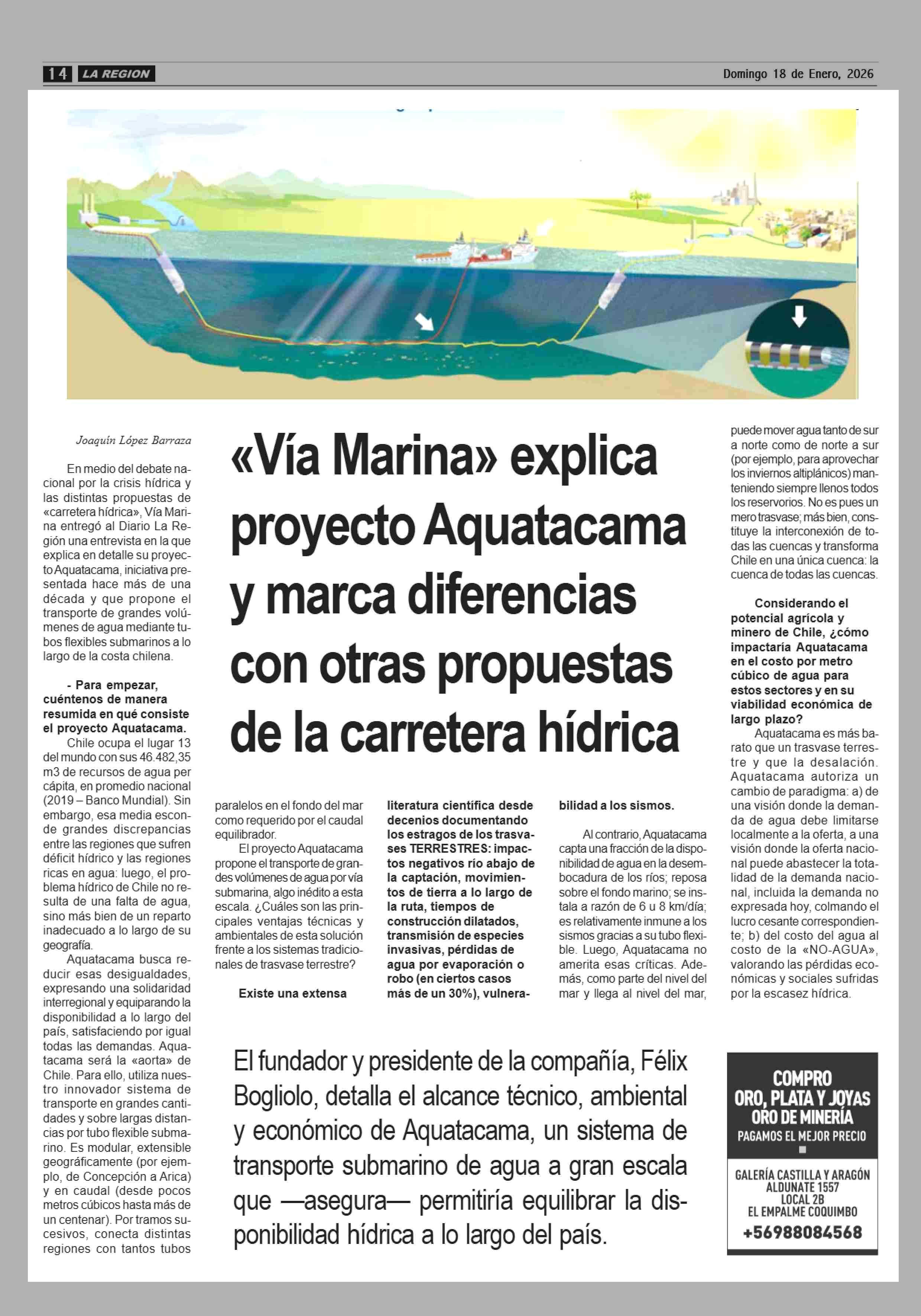 «Vía Marina» explica proyecto Aquatacama y marca diferencias con otras propuestas de la carretera hídrica 18-01-2026 Diario la Región |