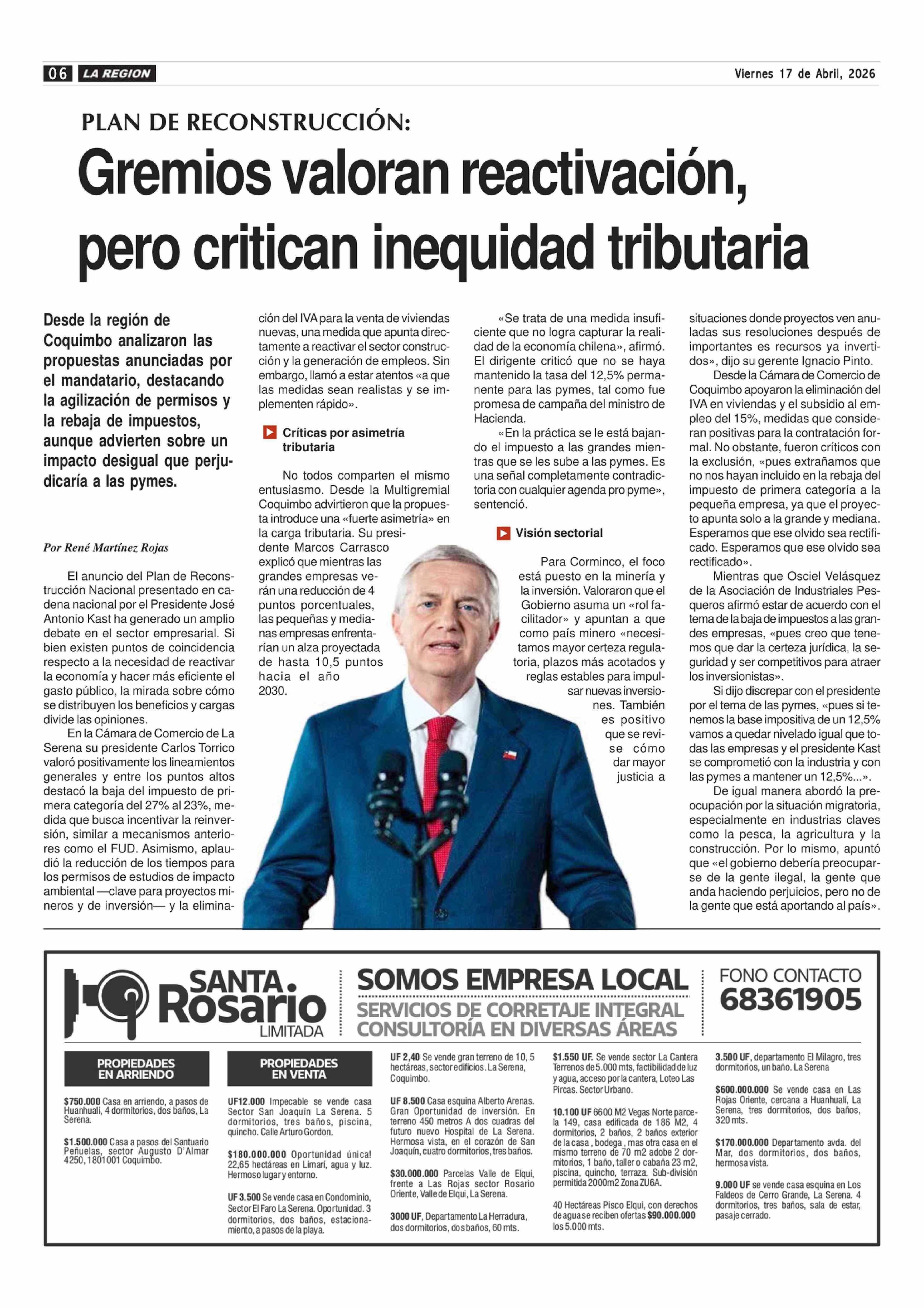 Gremios valoran reactivación, pero critican inequidad tributaria 17-04-2026 Diario la Región |