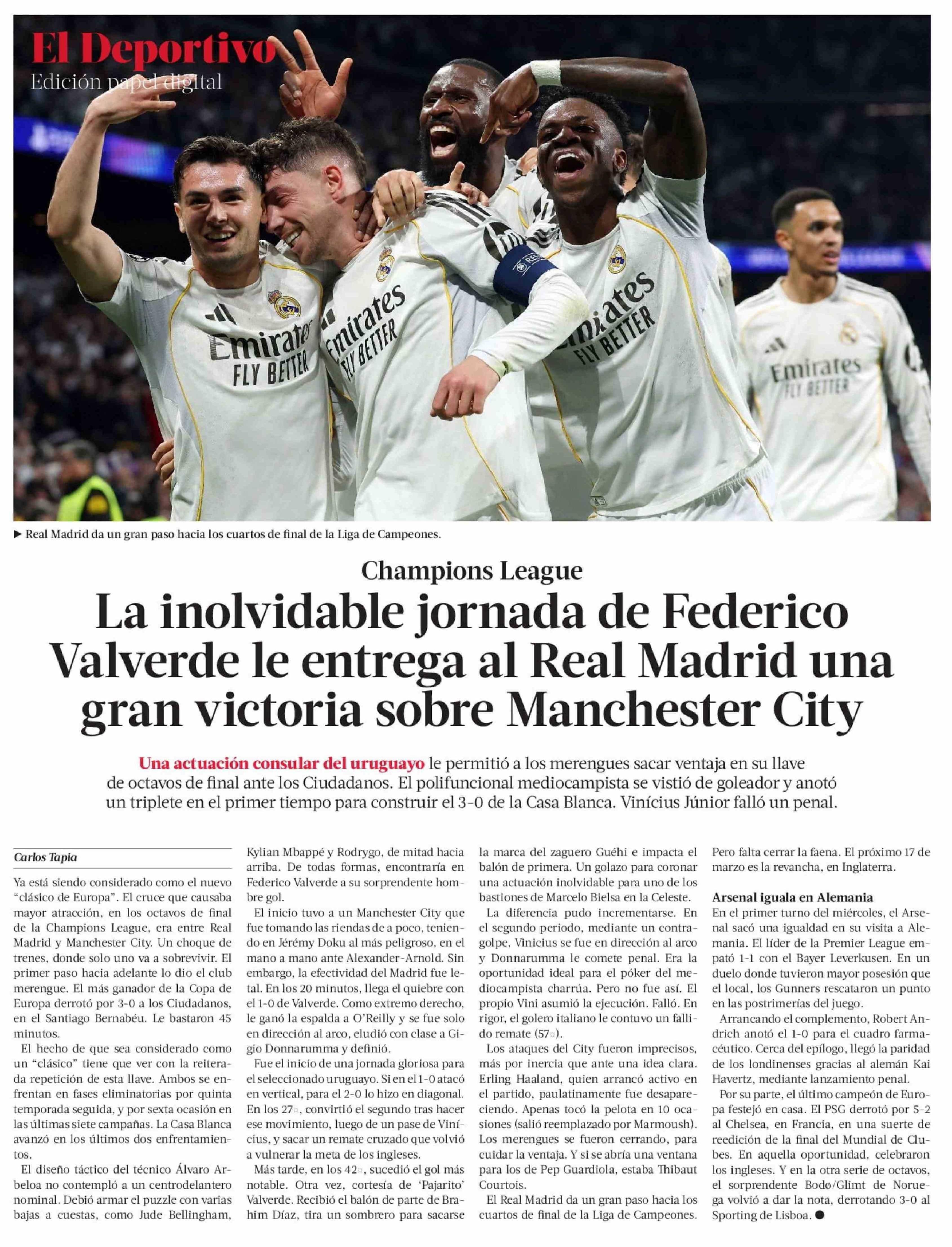 La inolvidable jornada de Federico Valverde le entrega al Real Madrid una gran victoria sobre Manchester City 12-03-2026 La Tercera |
