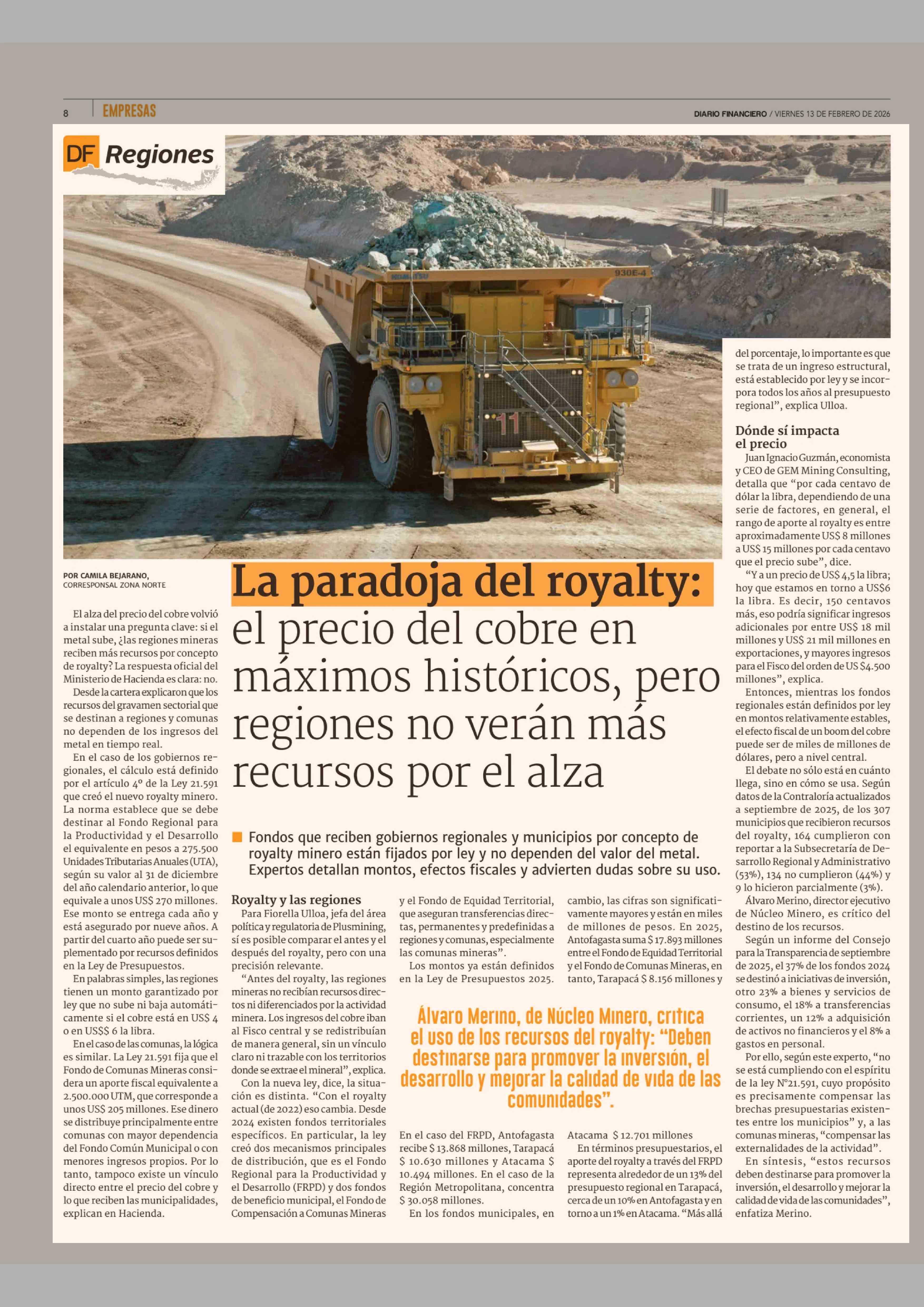 La paradoja del royalty: el precio del cobre en máximos históricos, pero regiones no verán más recursos por el alza 13-02-2026 Diario Financiero |