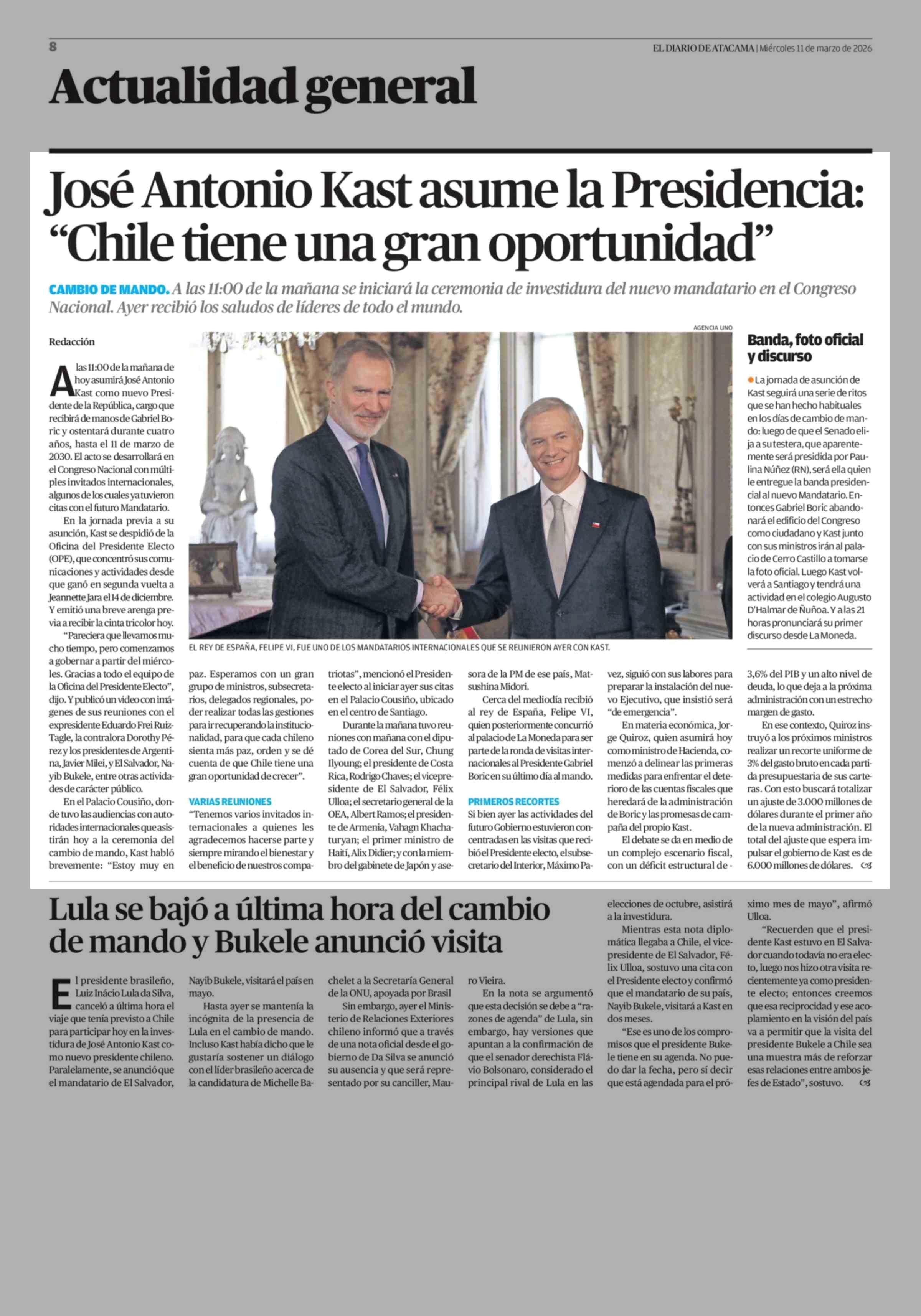 José Antonio Kast asume la Presidencia: "Chile tiene una gran oportunidad" 11-03-2026 El Diario de Atacama |