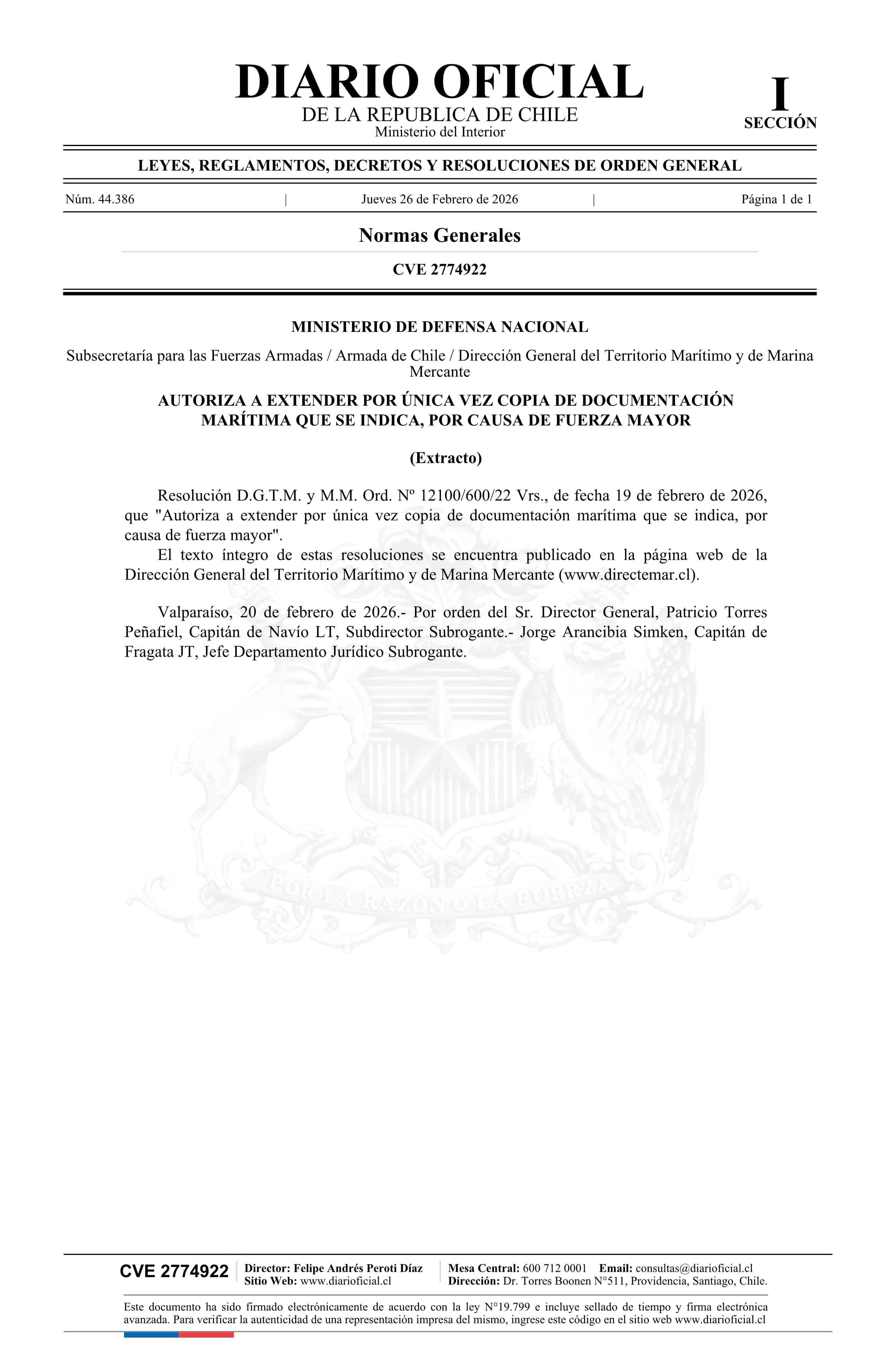 Extracto de resolución número 12100/600/22 Vrs., de 2026.- Autoriza extender por única vez copia de documentación marítima que indica, por causa de fuerza mayor