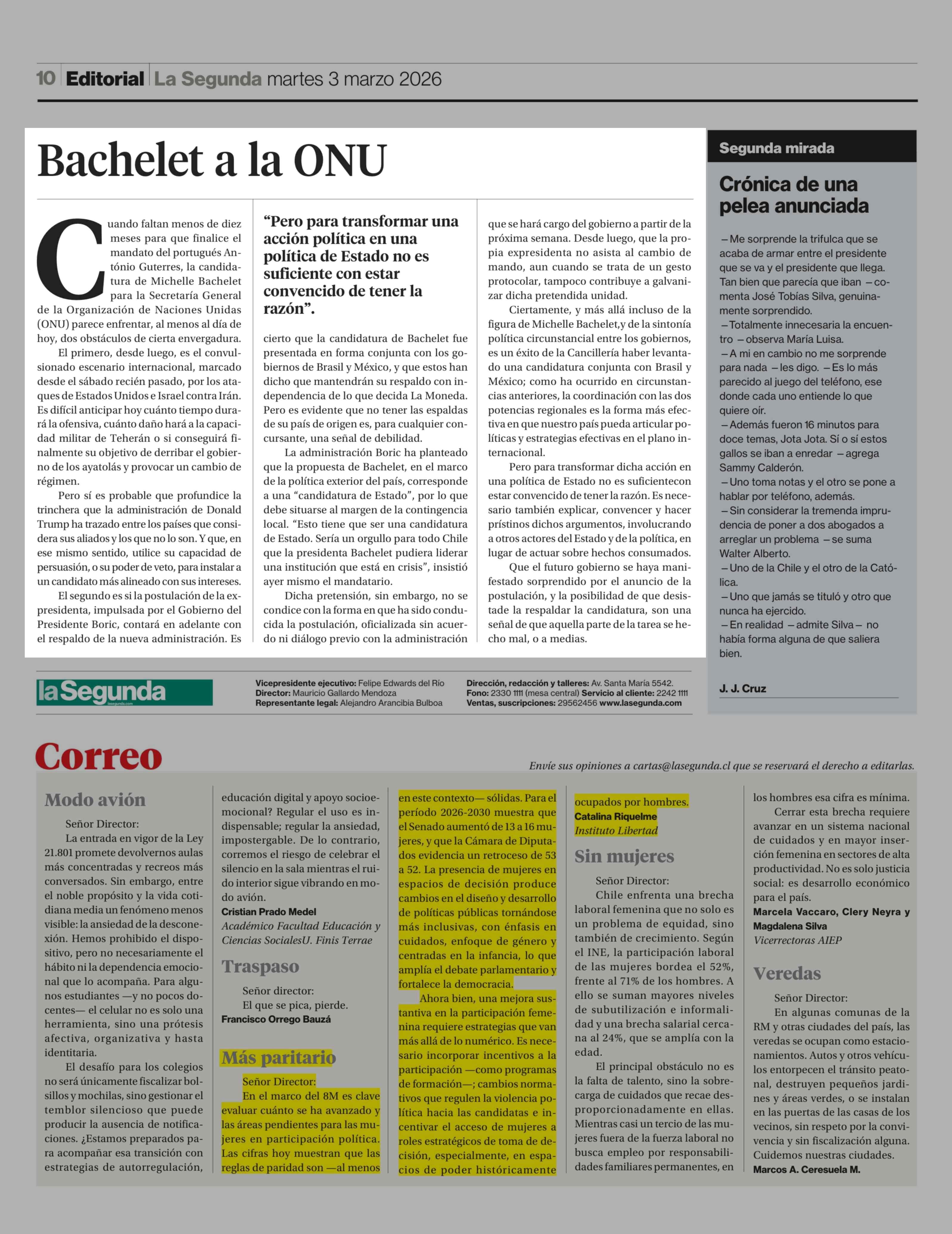 Editorial: Bachelet a la ONU 03-03-2026 La Segunda |