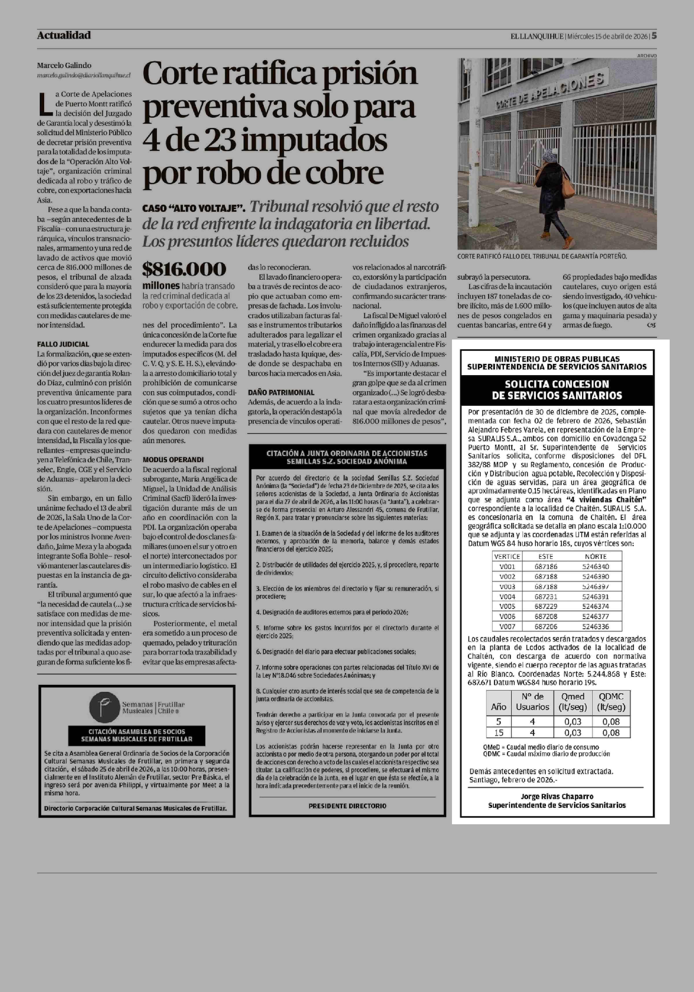 EXTRACTOS: SOLICITA CONCESION DE SERVICIOS SANITARIOS 15-04-2026 El Llanquihue |