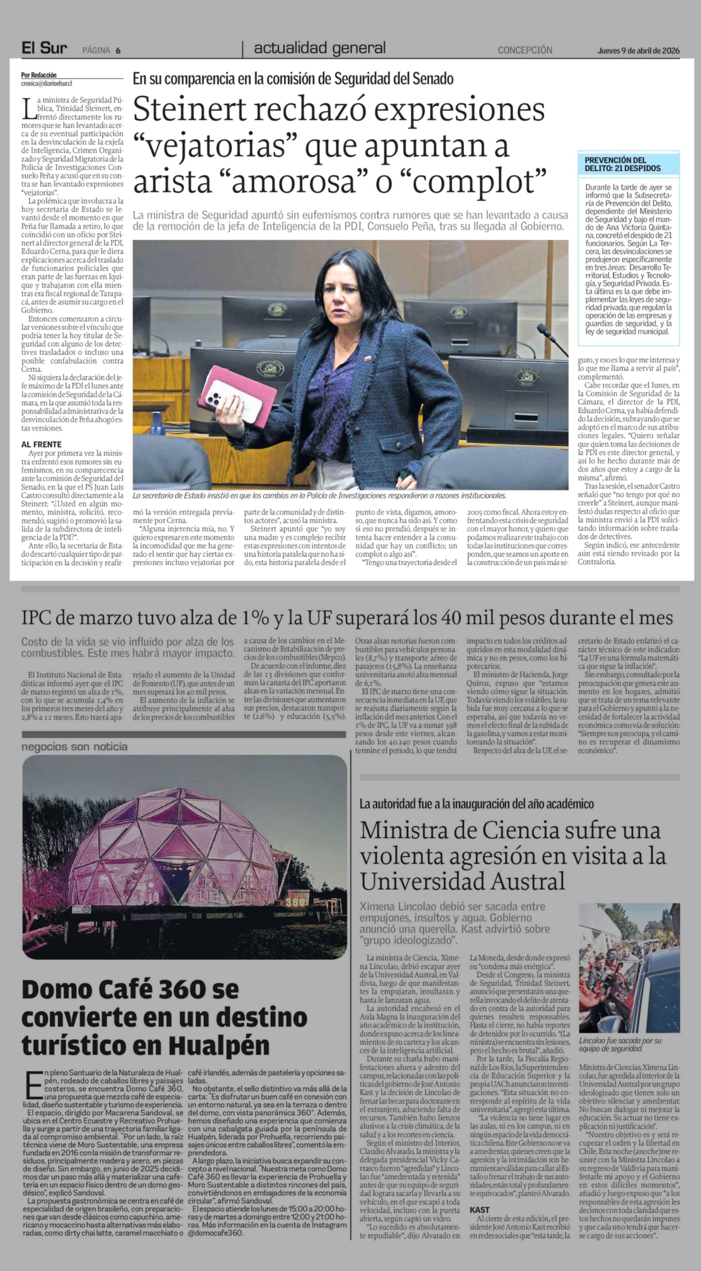 Steinert rechazó expresiones "vejatorias" que apuntan a arista "amorosa" o "complot" 09-04-2026 El Sur |