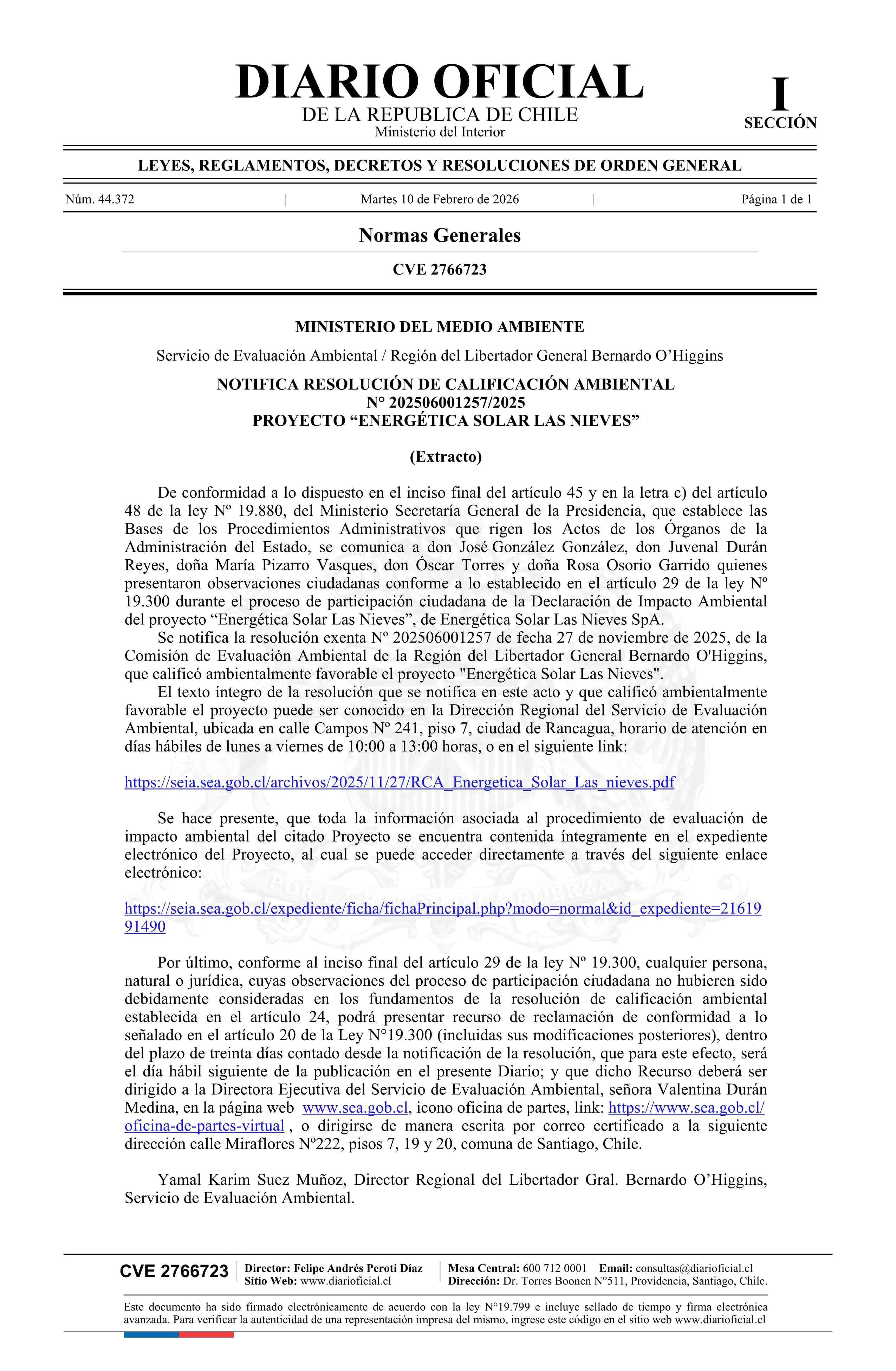 Extracto de resolución exenta número 202506001257, de 2025.- Califica Ambientalmente Favorable el Proyecto Energética Solar Las Nieves 10-02-2026 Diario Oficial Edición Electrónica |