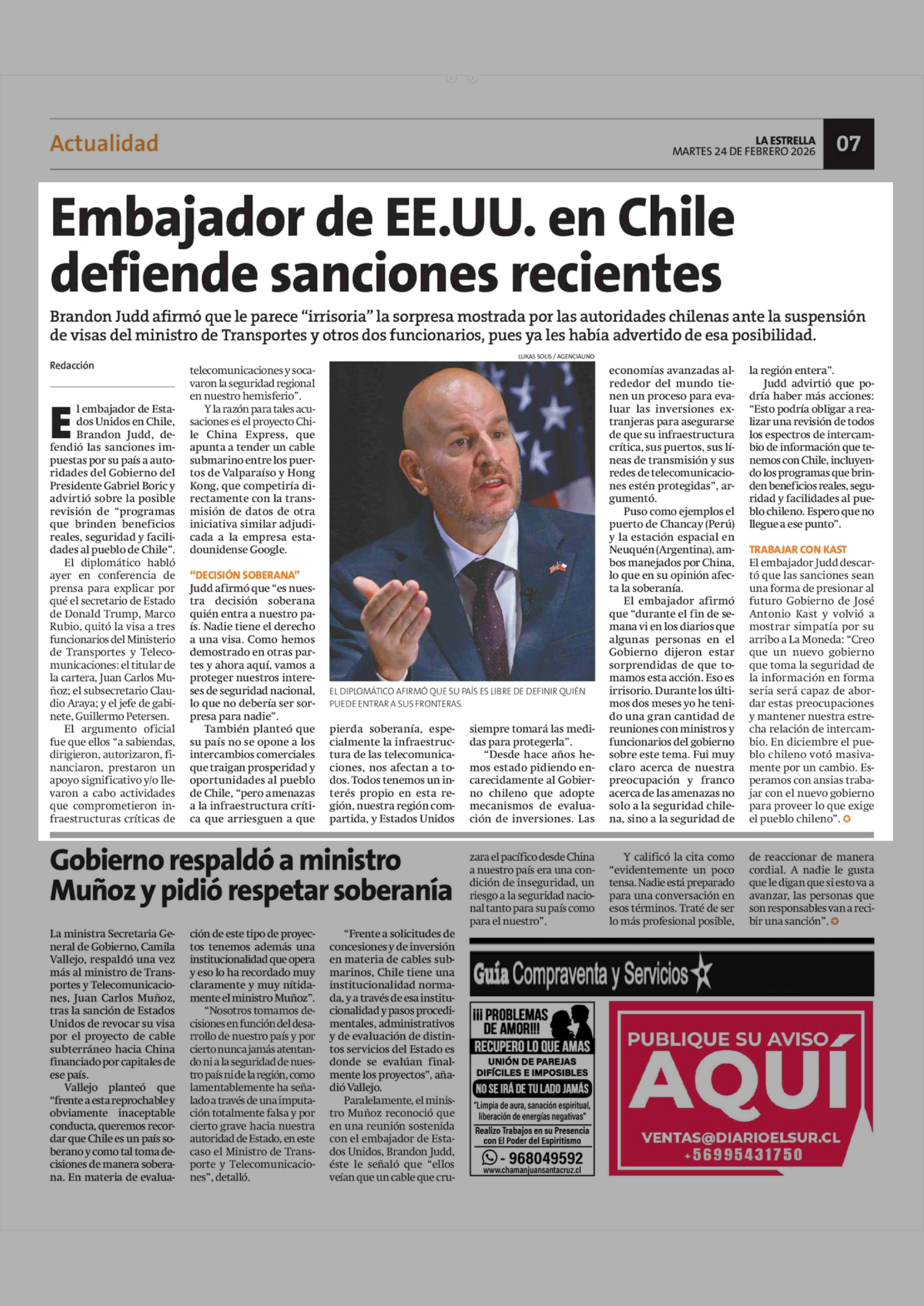 Embajador de EE.UU. en Chile defiende sanciones recientes 24-02-2026 La Estrella de Concepción |