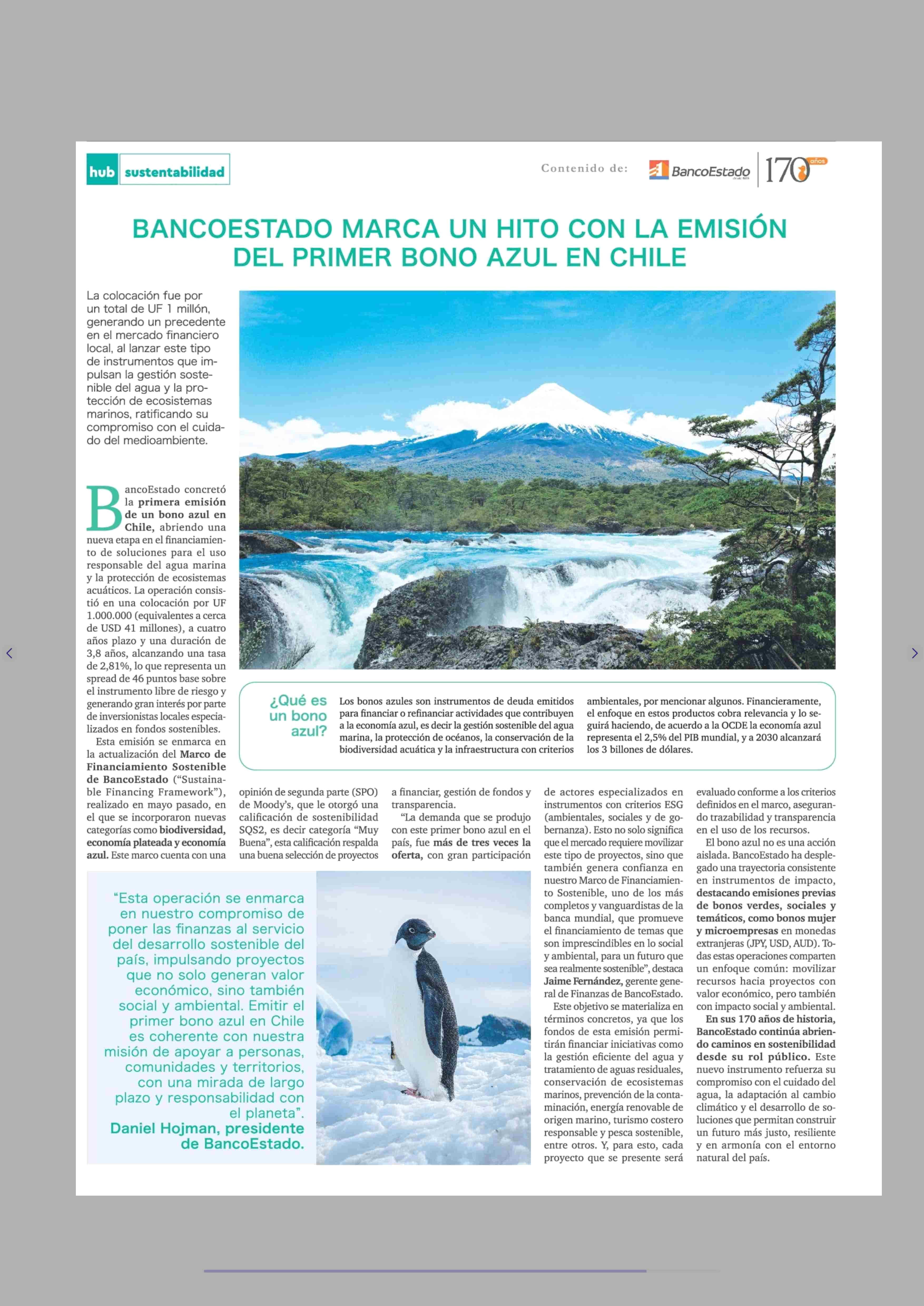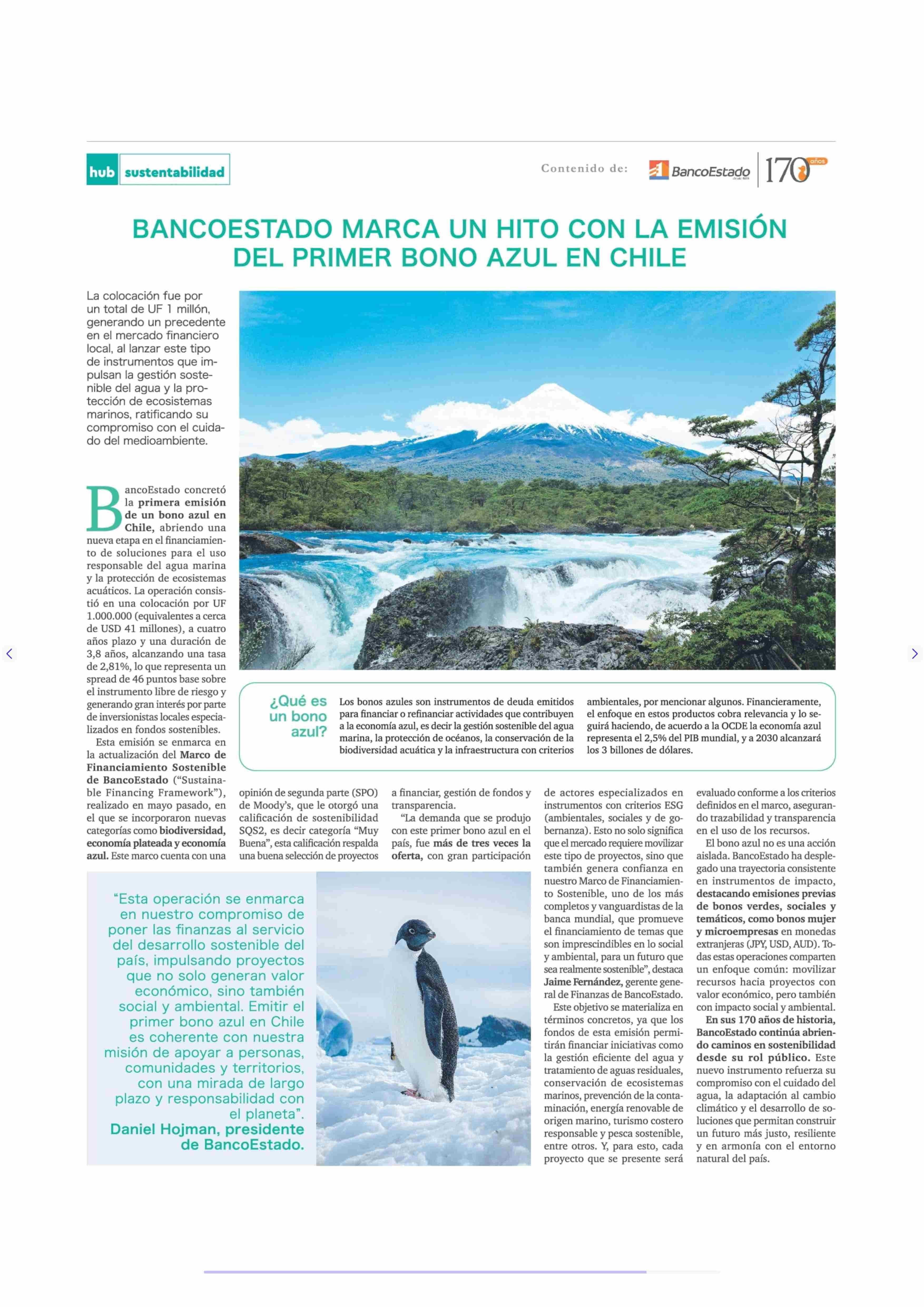 BANCOESTADO MARCA UN HITO CON LA EMISIÓN DEL PRIMER BONO AZUL EN CHILE 21-06-2025 La Tercera |