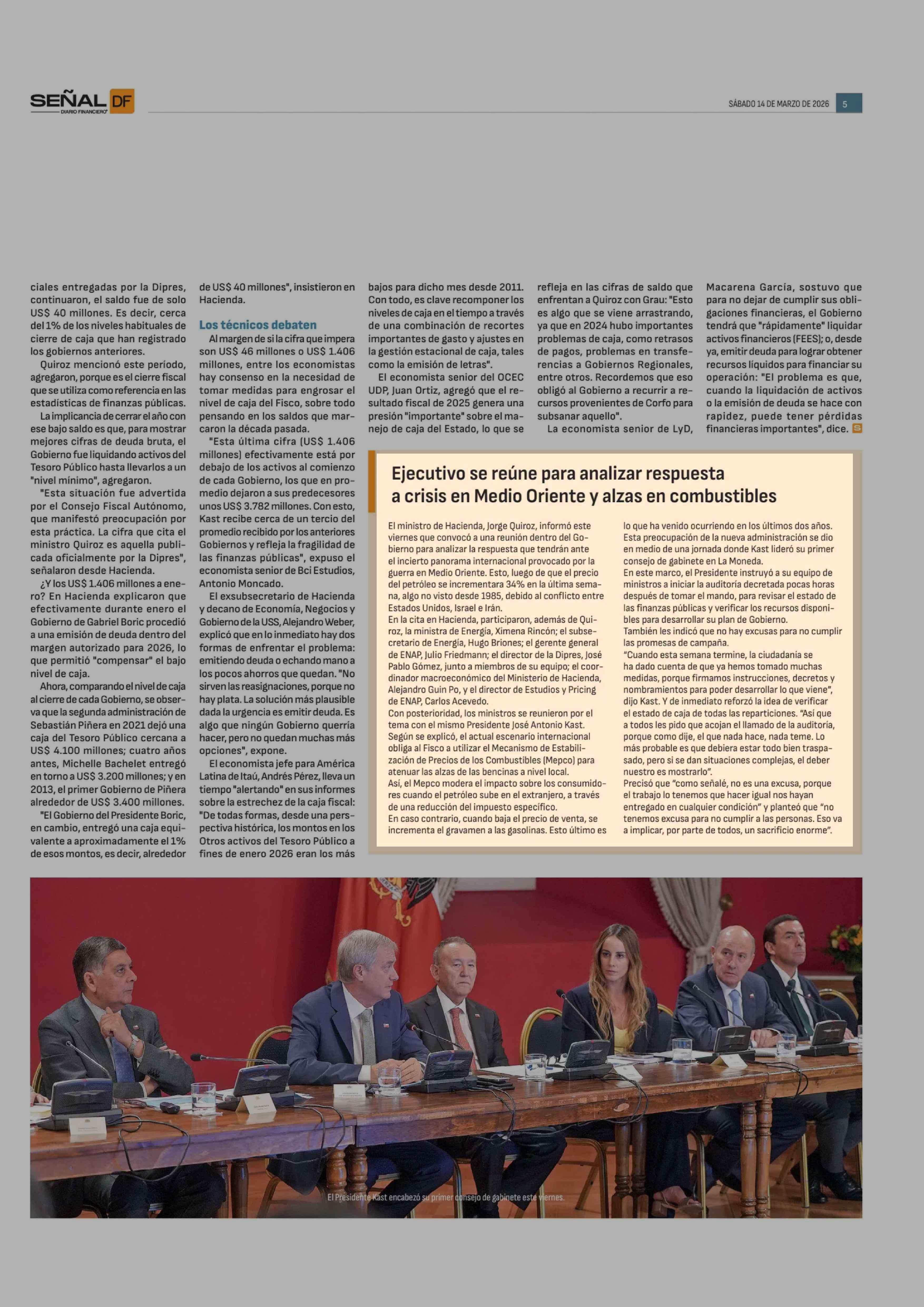 Ejecutivo se reúne para analizar respuesta a crisis en Medio Oriente y alzas en combustibles 14-03-2026 Diario Financiero |