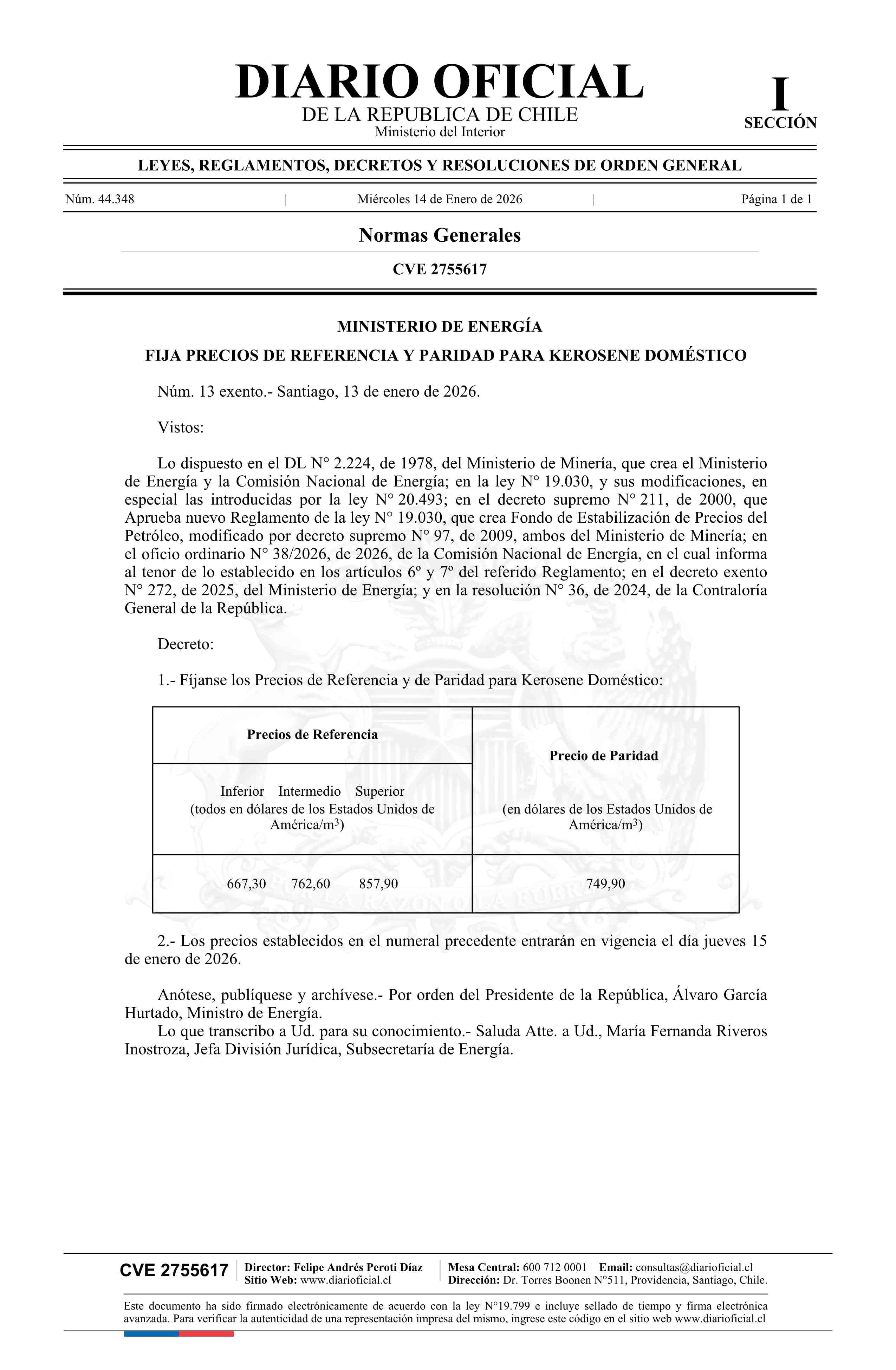 Decreto exento número 13, de 2026.- Fija precios de referencia y paridad para kerosene doméstico 14-01-2026 DIARIO OFICIAL CHILE - BOLETÍN OFICIAL DE MINERÍA |