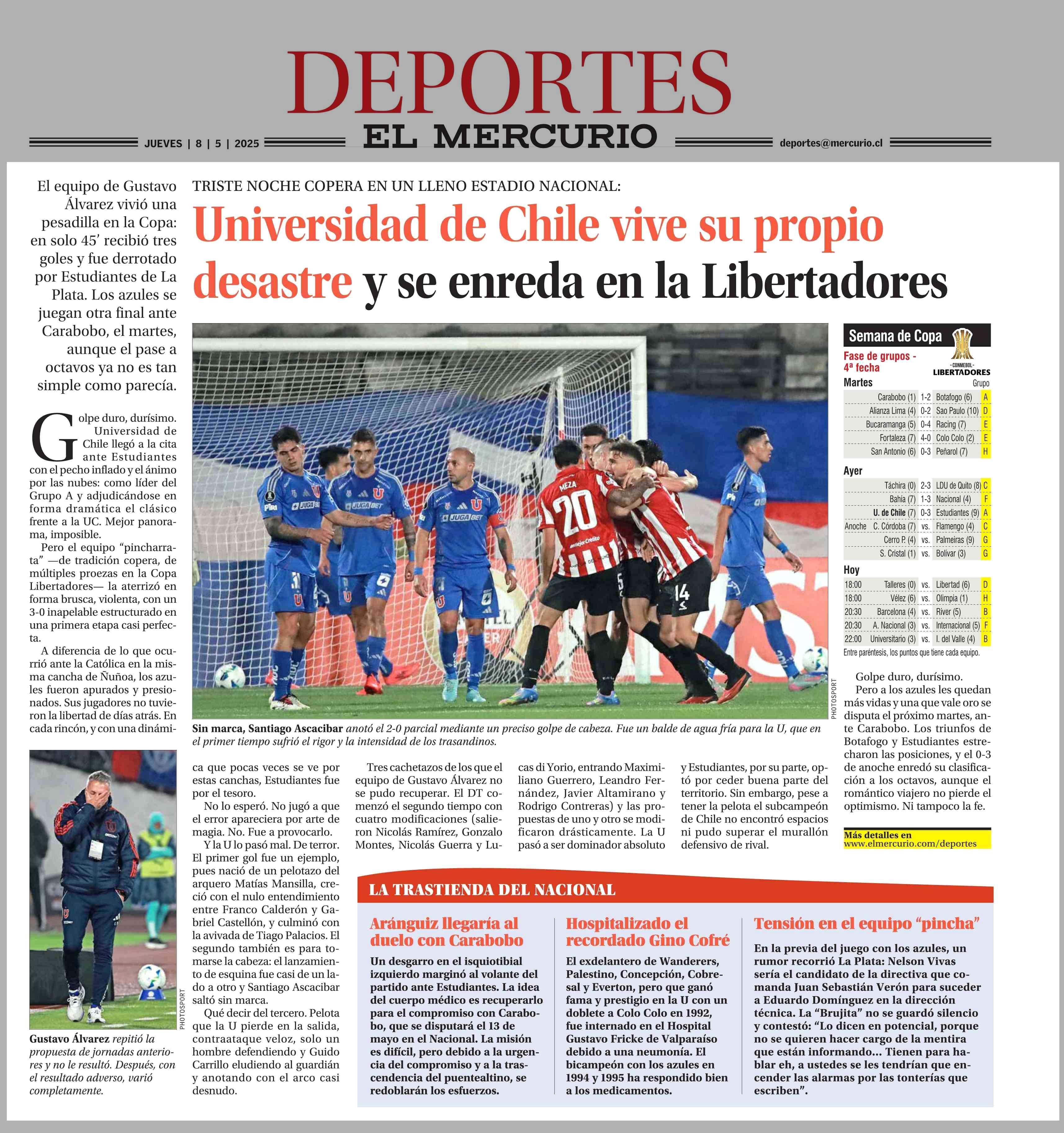 Universidad de Chile vive su propio desastre y se enreda en la Libertadores 08-05-2025 El Mercurio |