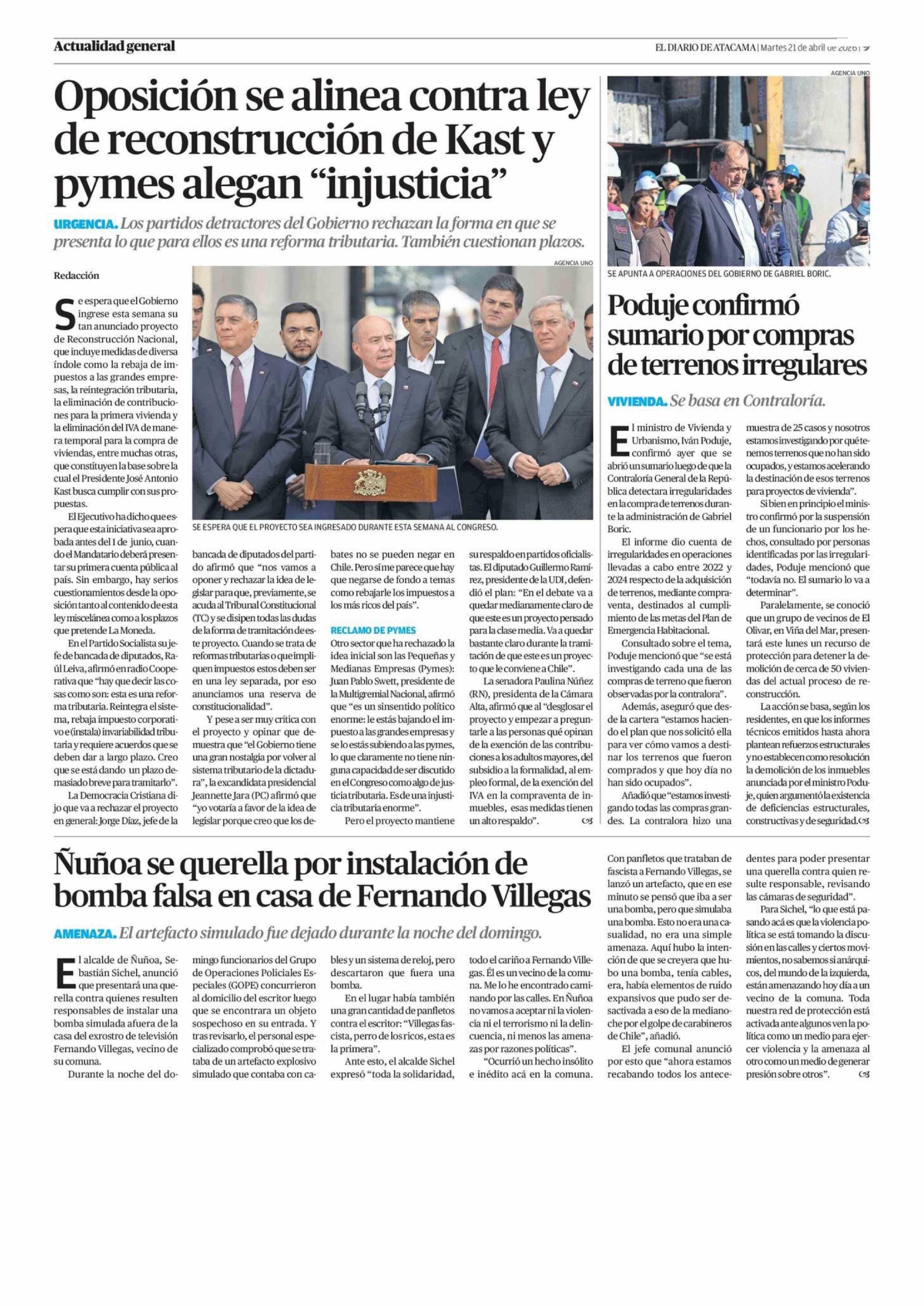 Oposición se alinea contra ley de reconstrucción de Kast y pymes alegan "injusticia" 21-04-2026 El Diario de Atacama |
