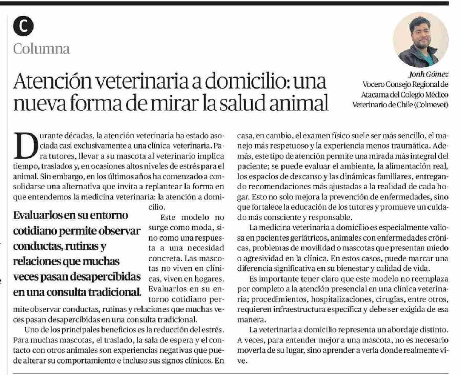 Columnas de Opinión: Atención veterinaria a domicilio: una nueva forma de mirar la salud animal 20-01-2026 El Diario de Atacama |