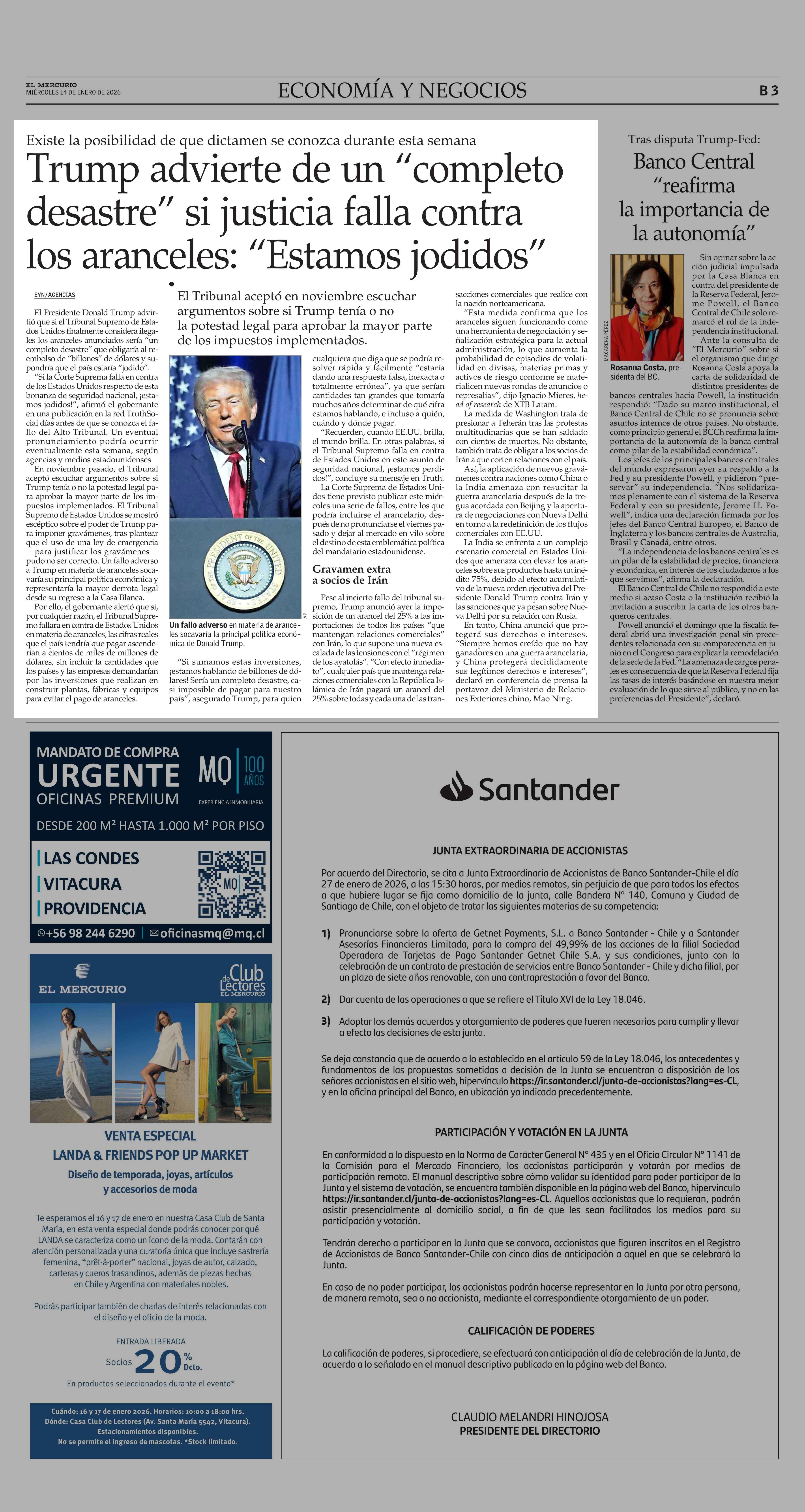 Trump advierte de un "completo desastre" si justicia falla contra los aranceles: "Estamos jodidos" 14-01-2026 El Mercurio |