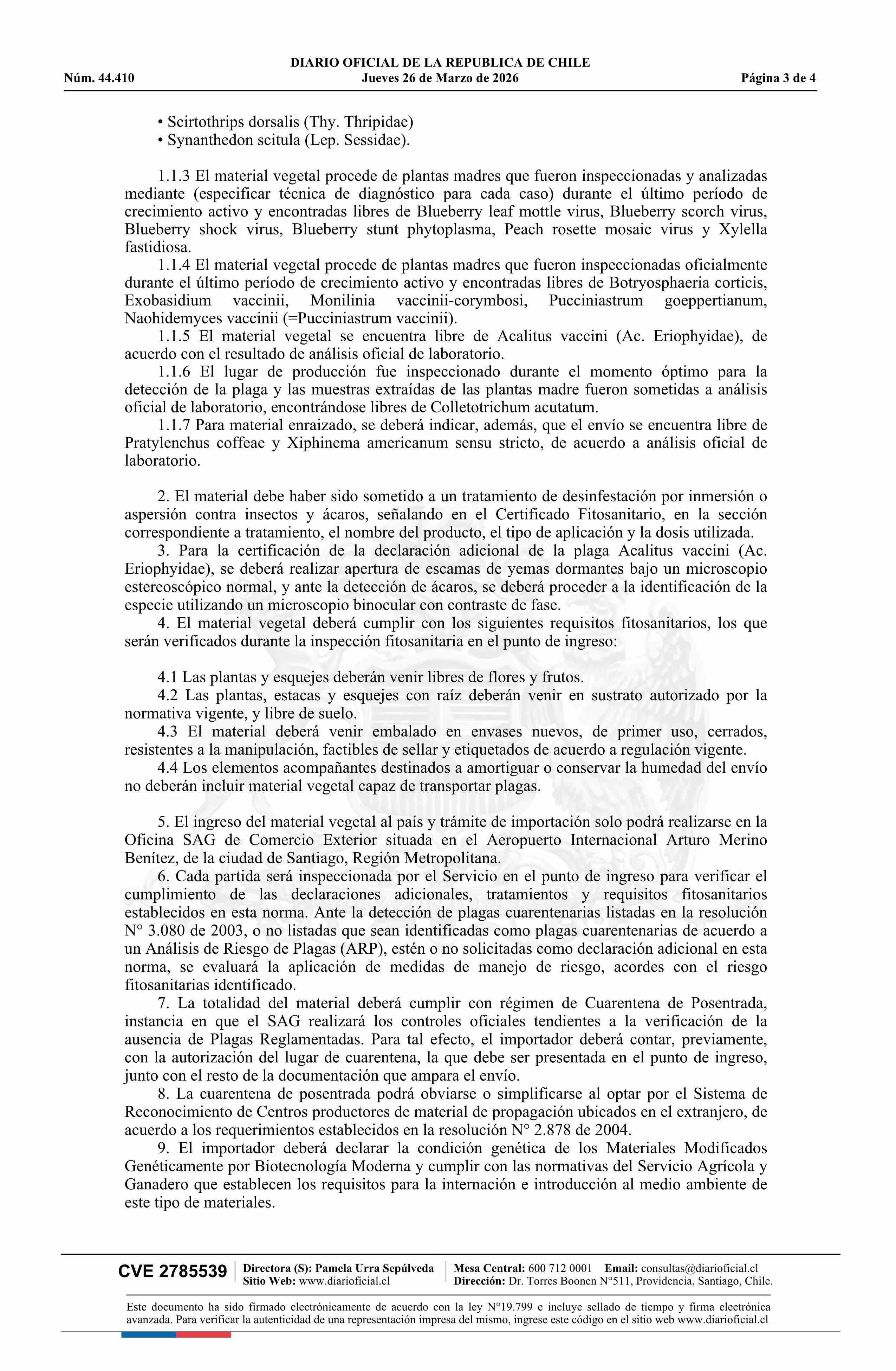 | Título: | Resolución exenta número 2.071, de 2026.- Establece requisitos fitosanitarios de importación para plantas y esquejes de Vaccinium corymbosum (arándano) procedentes de Estados Unidos de Norteamérica, y modifica resolución N° 5.479, de 2006 |
