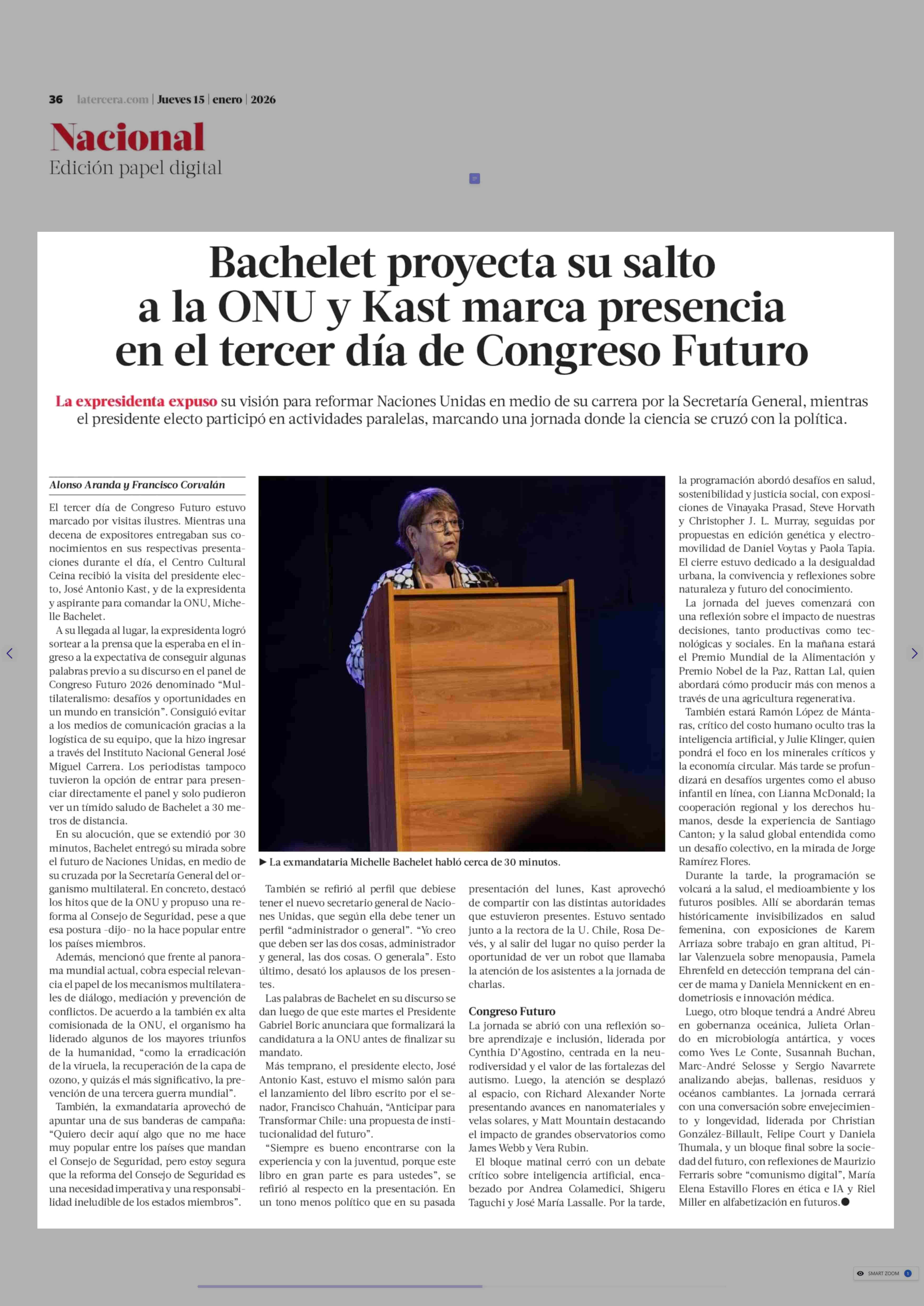 Título: Bachelet proyecta su salto a la ONU y Kast marca presencia en el tercer día de Congreso Futuro