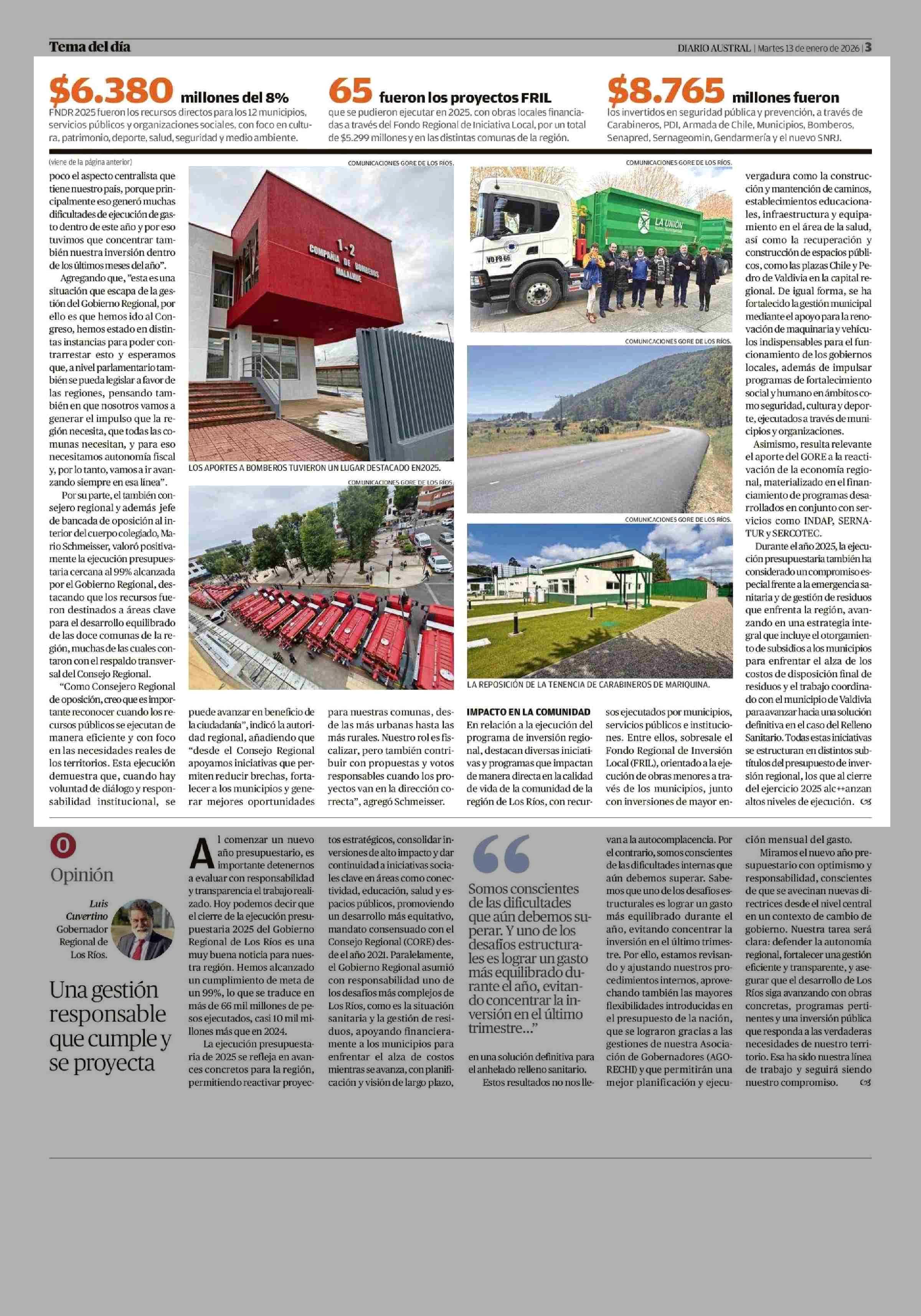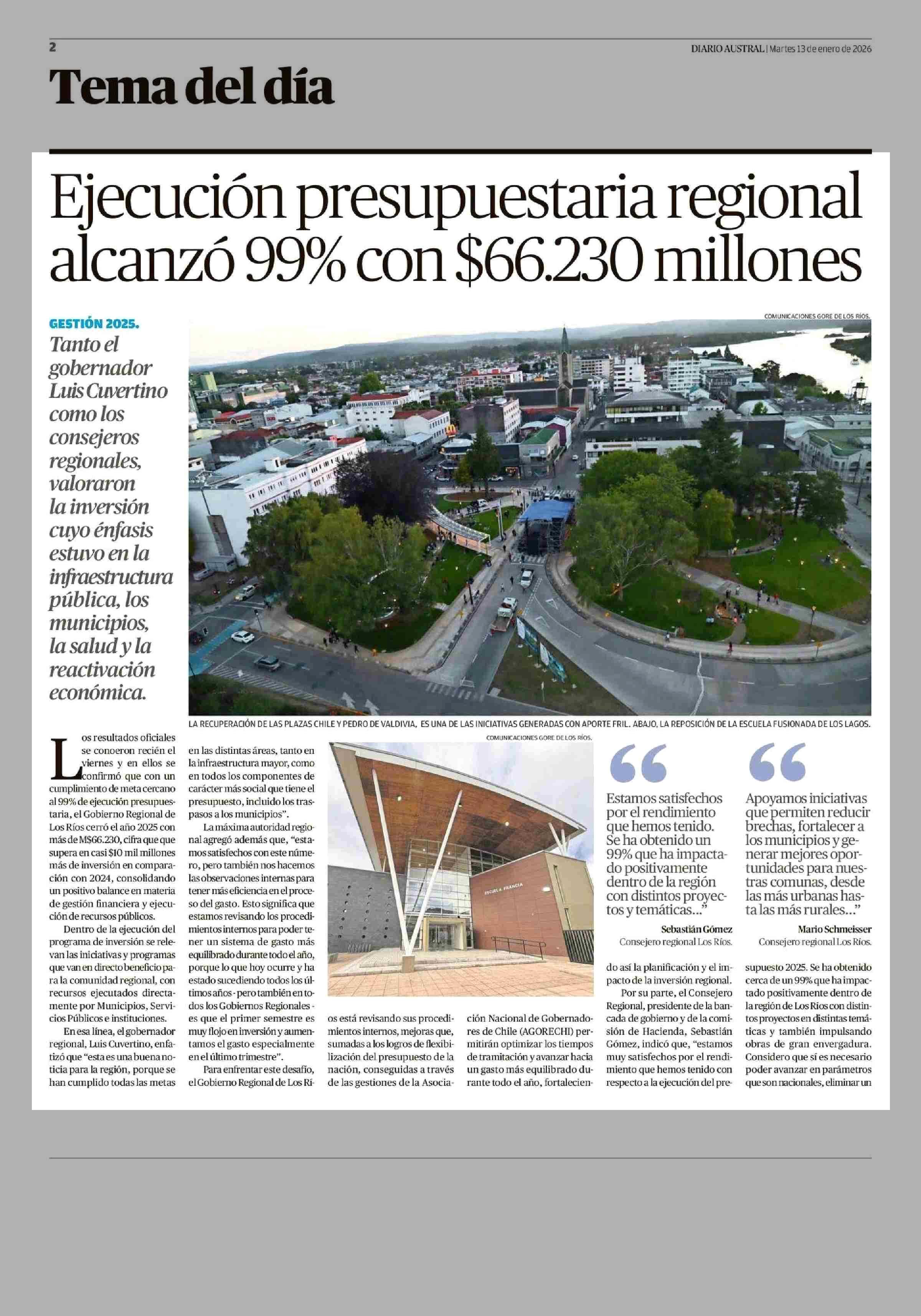 Ejecución presupuestaria regional alcanzó 99% con $66.230 millones 13-01-2026 Diario Austral Región de Los Ríos |