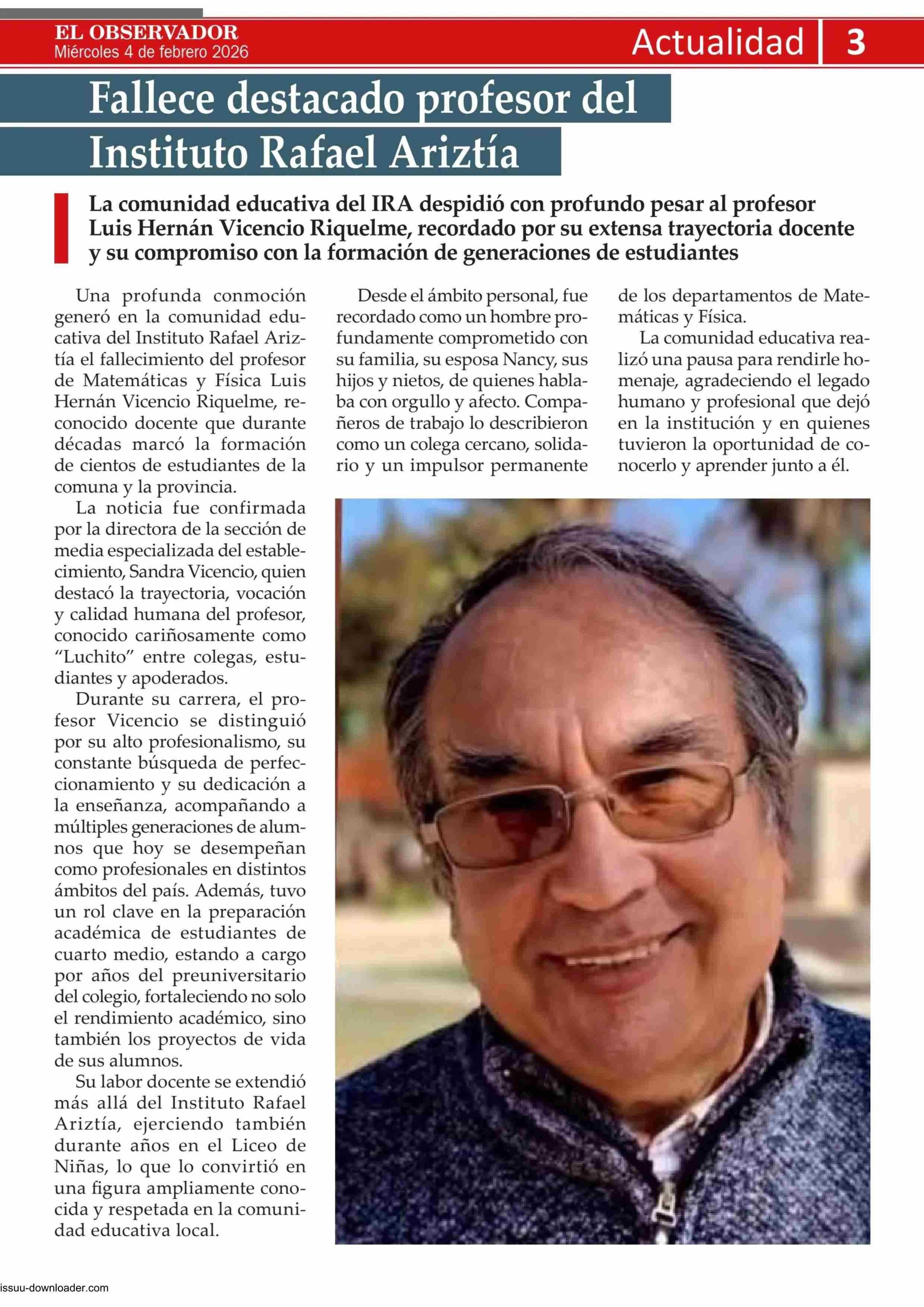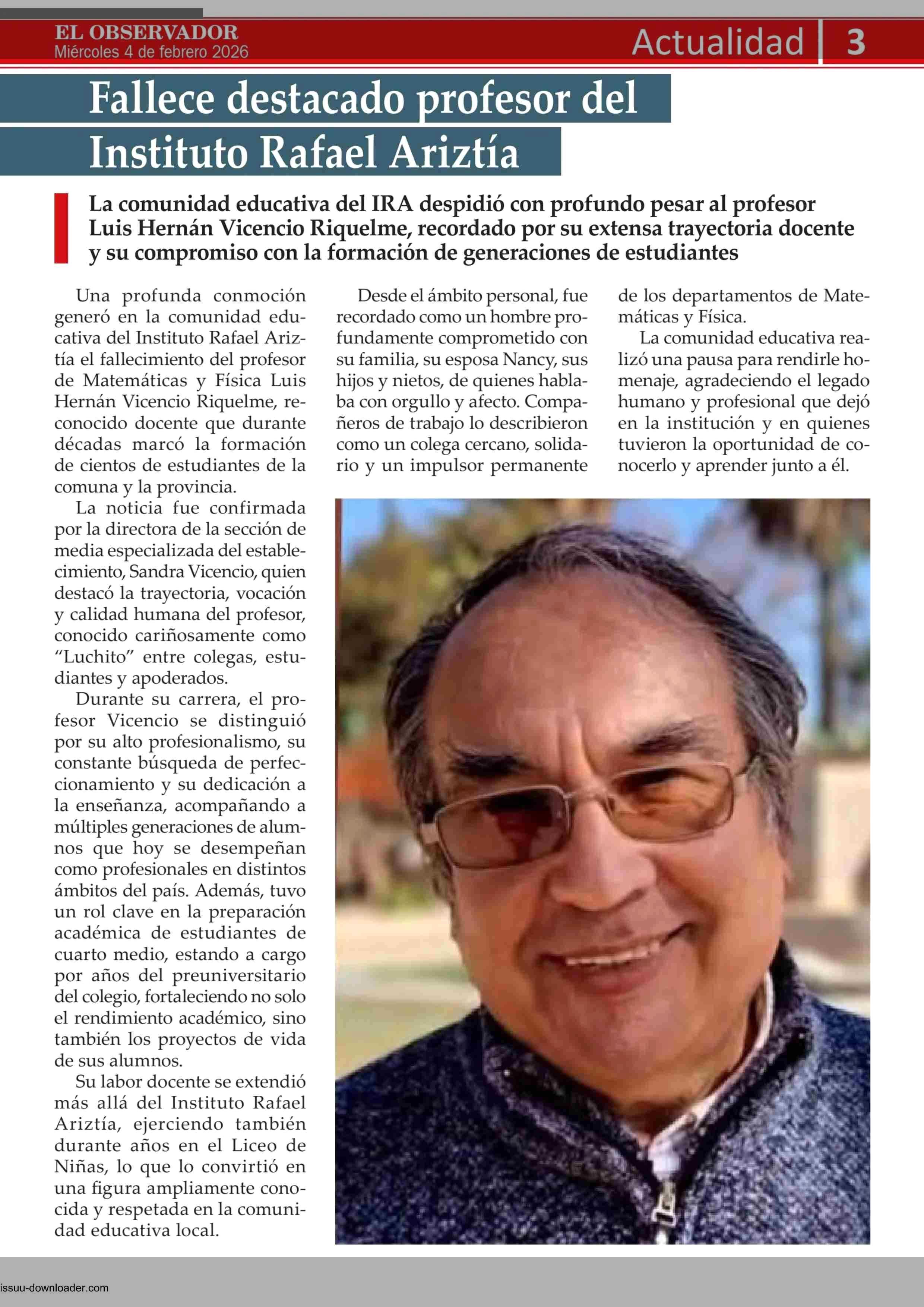 Fallece destacado profesor del Instituto Rafael Ariztía 04-02-2026 El Observador Vespertino |