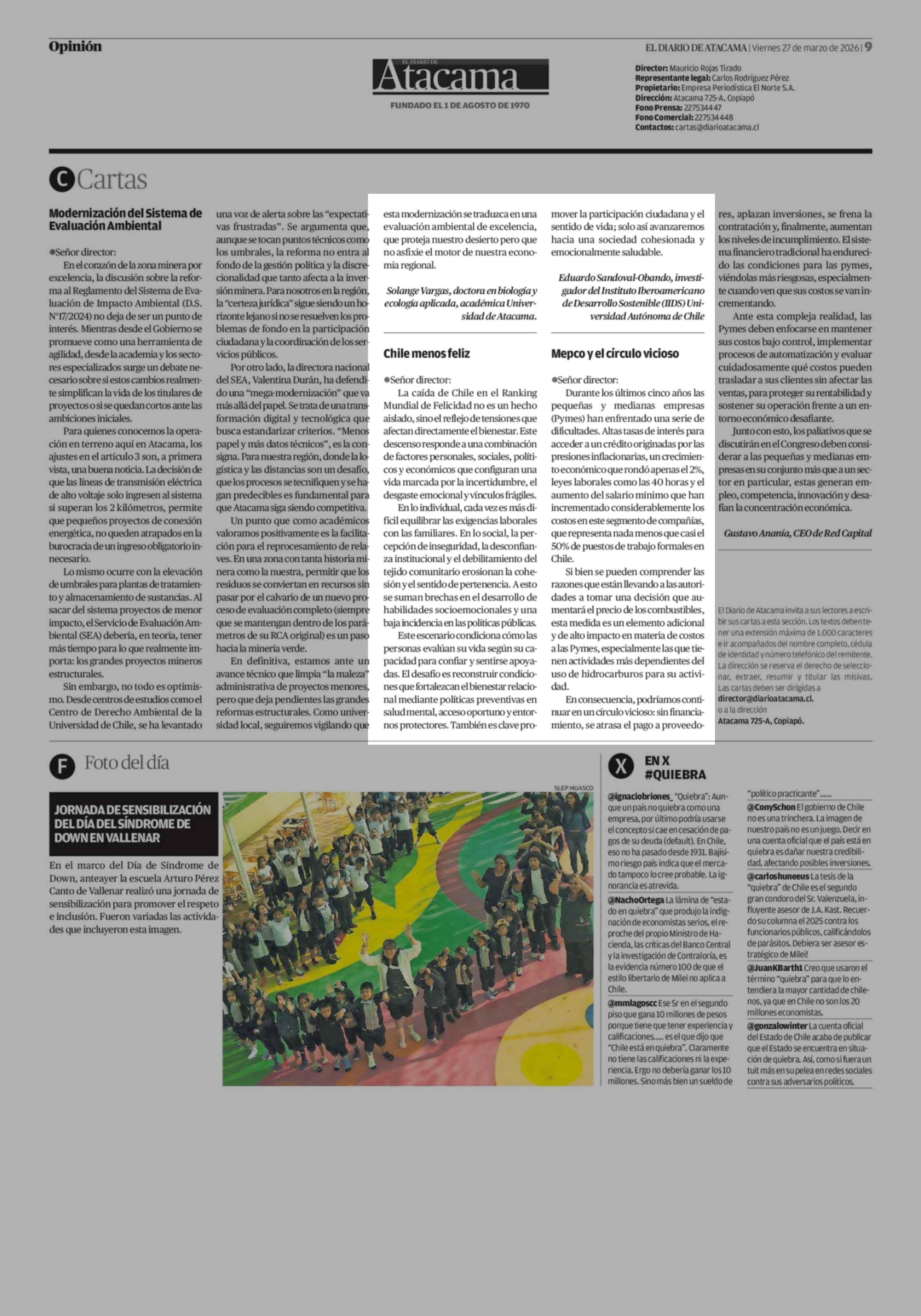 Cartas: Chile menos feliz 27-03-2026 El Diario de Atacama |