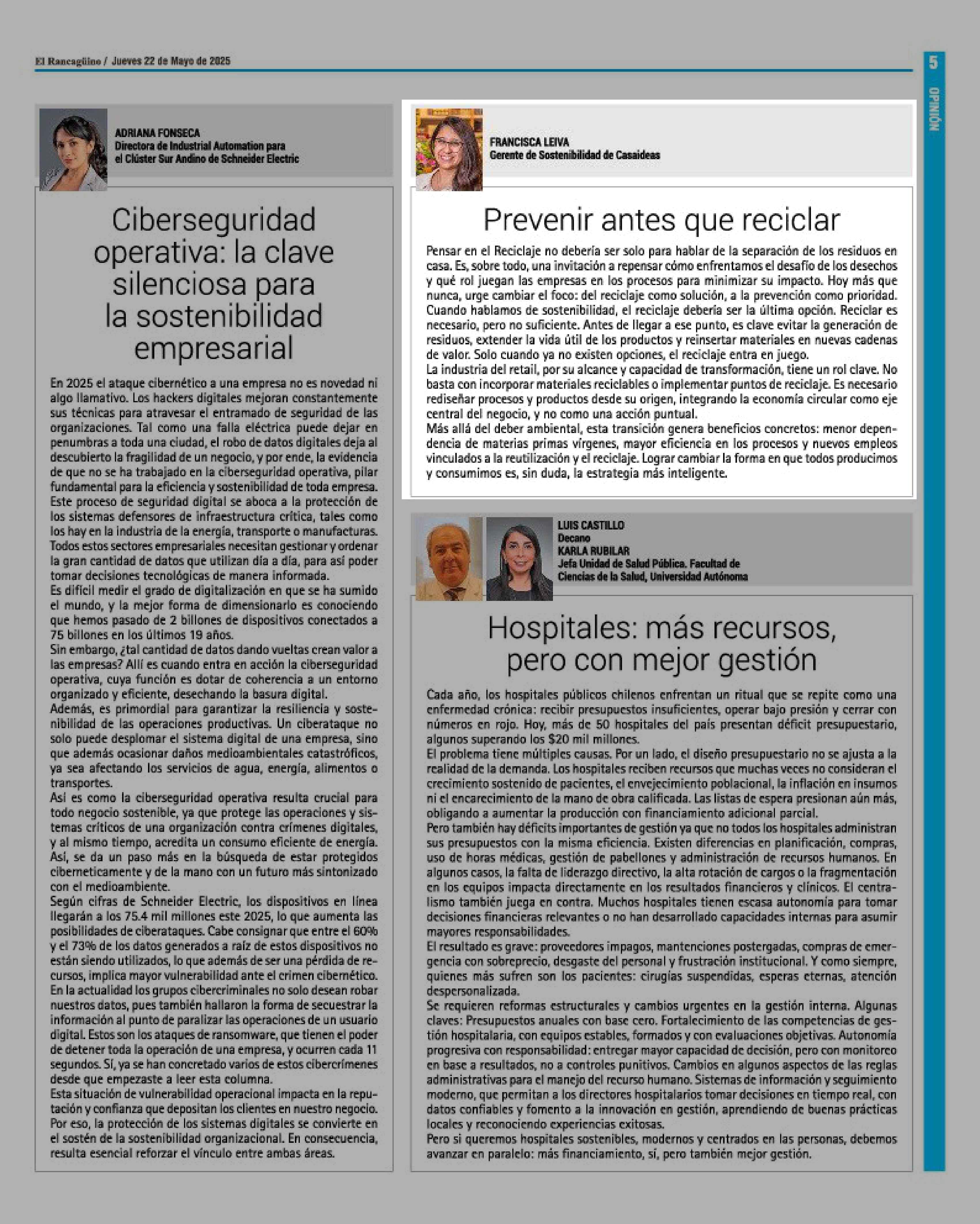 COLUMNAS DE OPINIÓN: Prevenir antes que reciclar 22-05-2025 El Rancagüino |