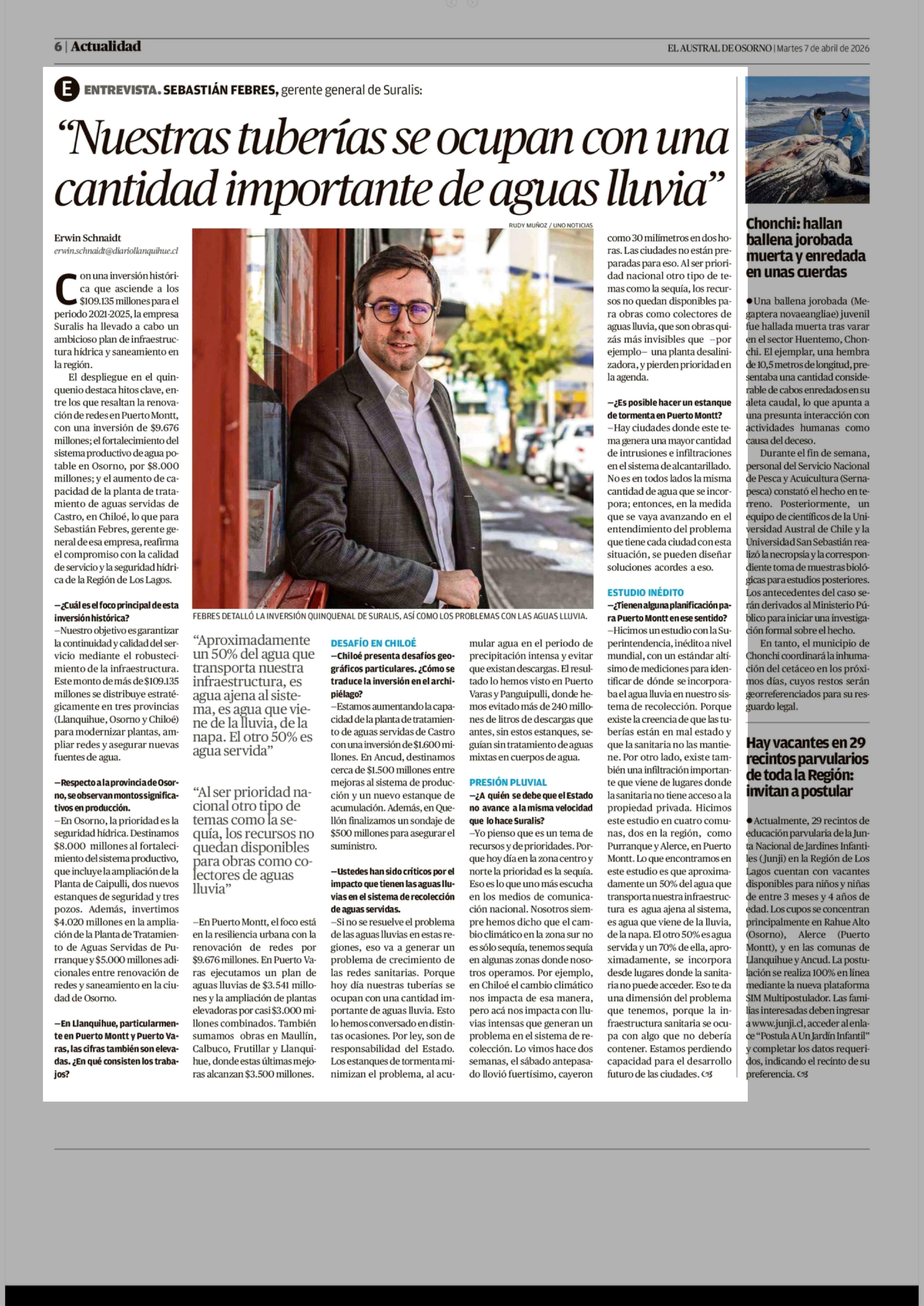 "Nuestras tuberías se ocupan con una cantidad importante de aguas lluvia" 07-04-2026 El Austral de Osorno |