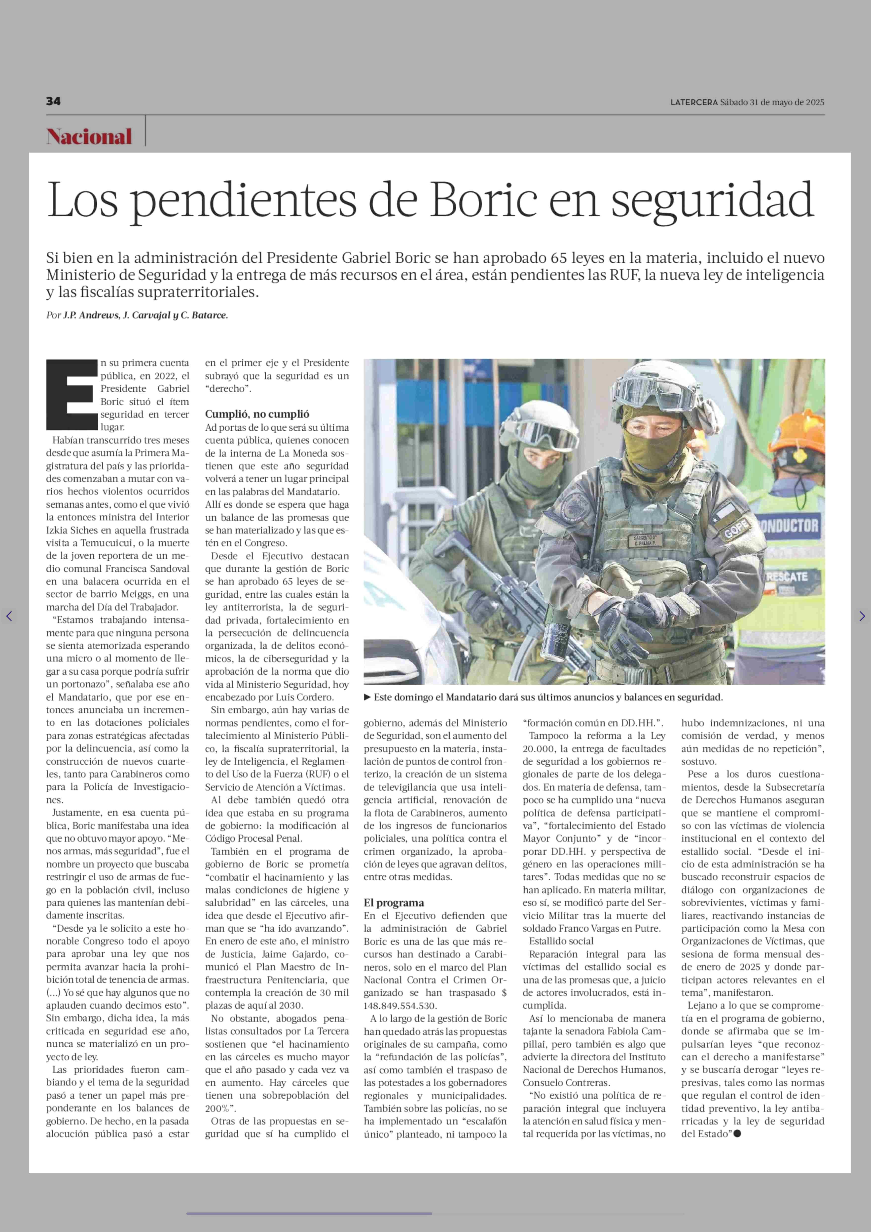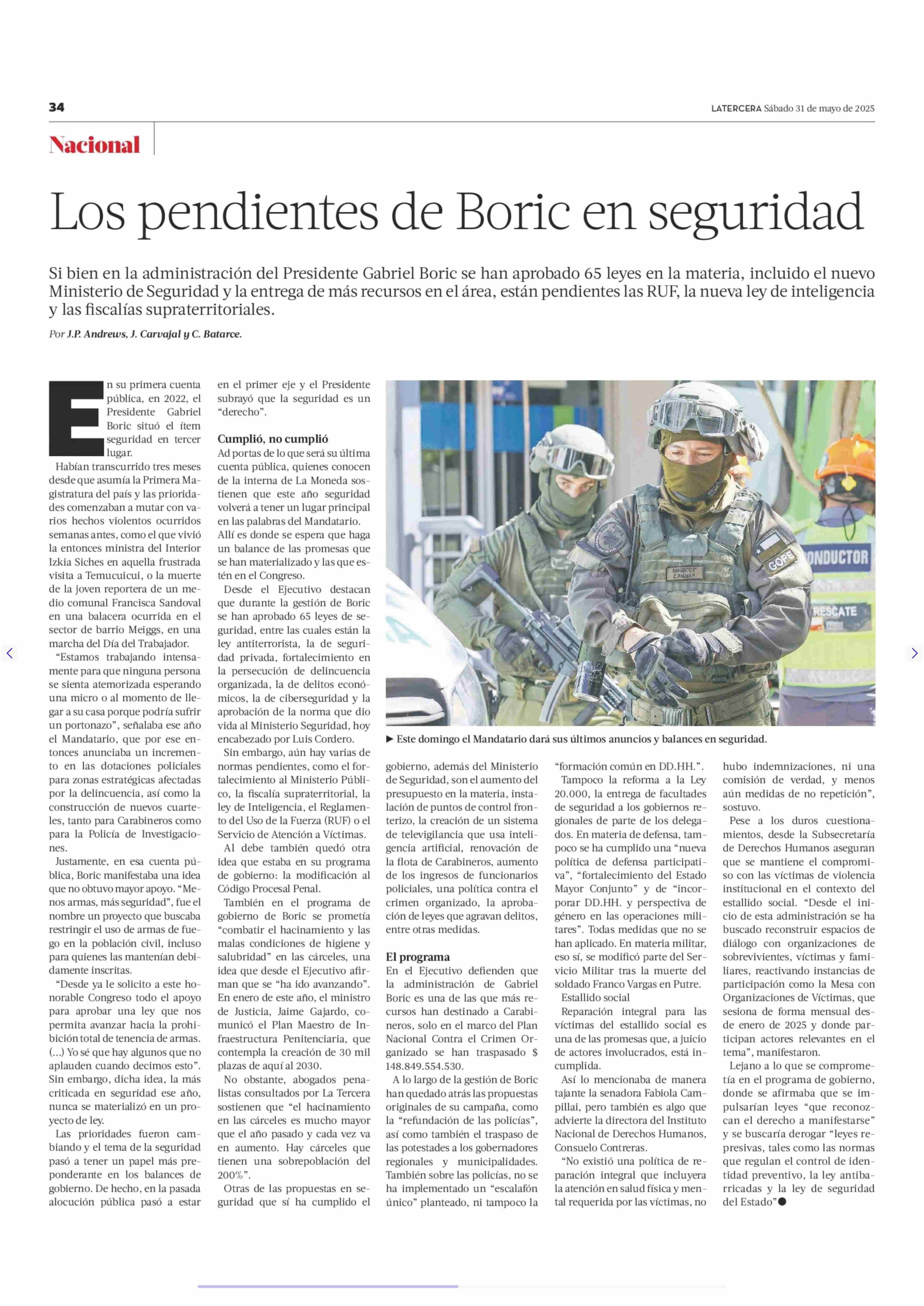 Los pendientes de Boric en seguridad 31-05-2025 La Tercera |