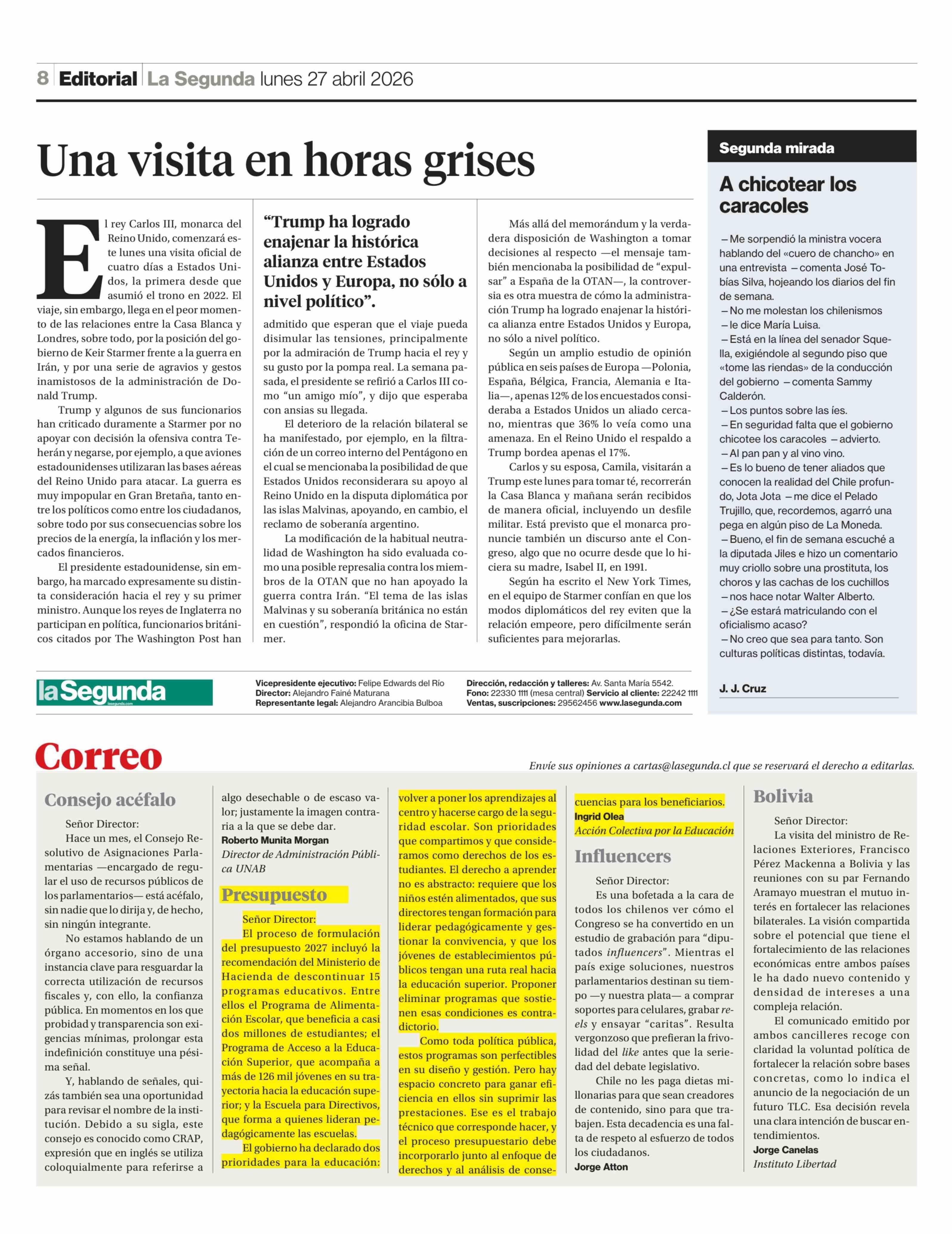 Cartas: Presupuesto 27-04-2026 La Segunda |