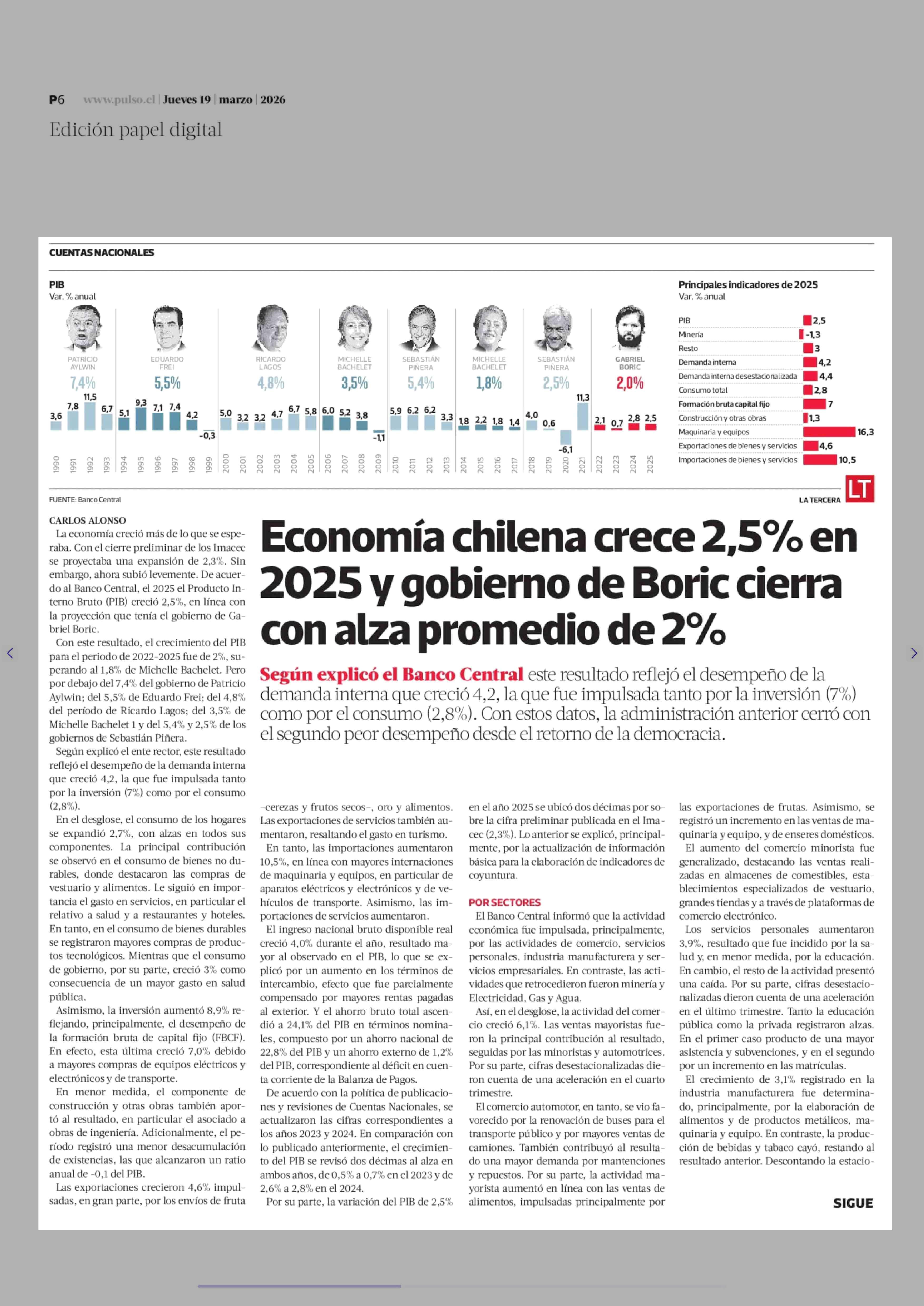 Título: Economía chilena crece 2,5% en 2025 y gobierno de Boric cierra con alza promedio de 2%