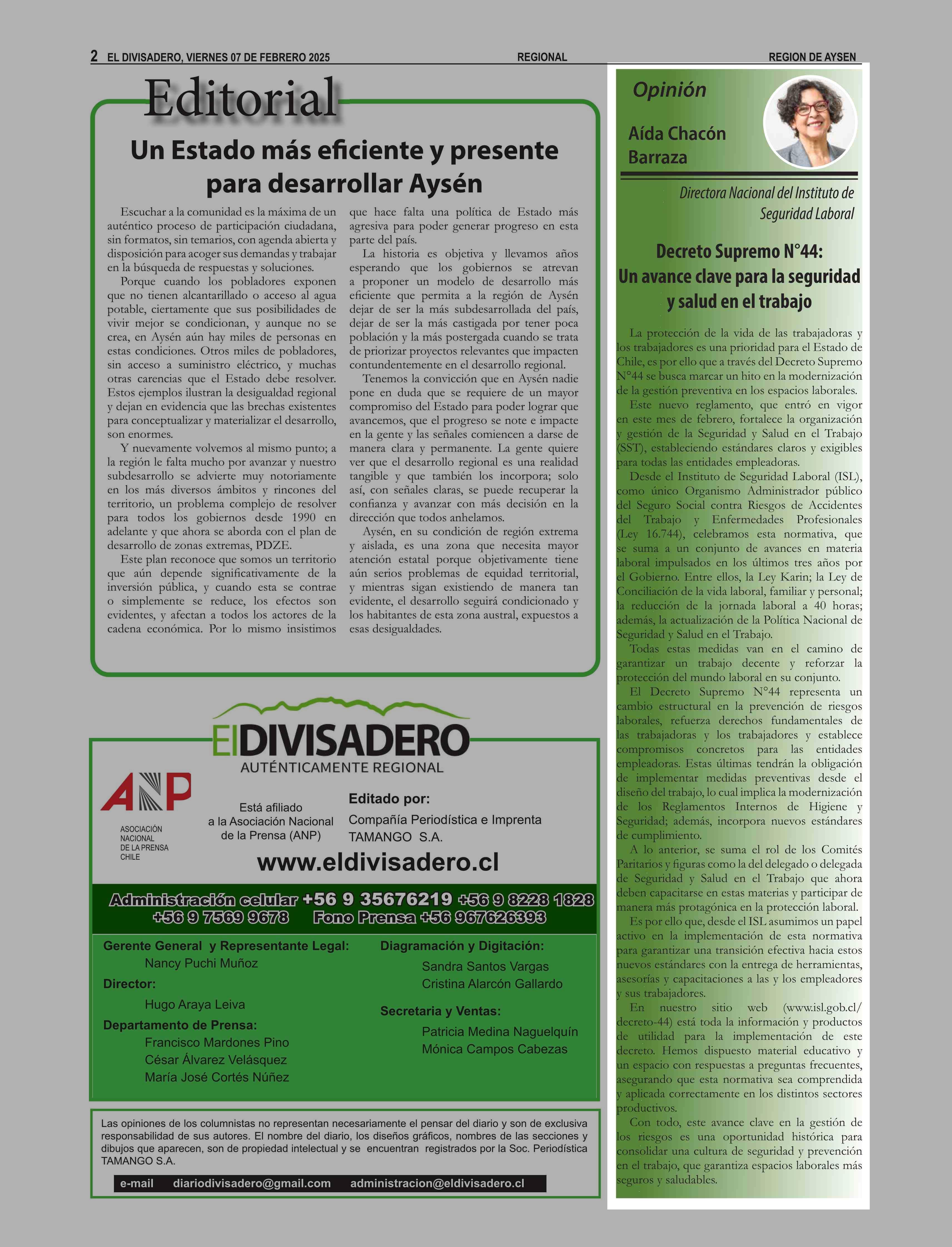 Columnas de Opinión: Decreto Supremo N°44: Un avance clave para la seguridad y salud en el trabajo 07-02-2025 El Divisadero |