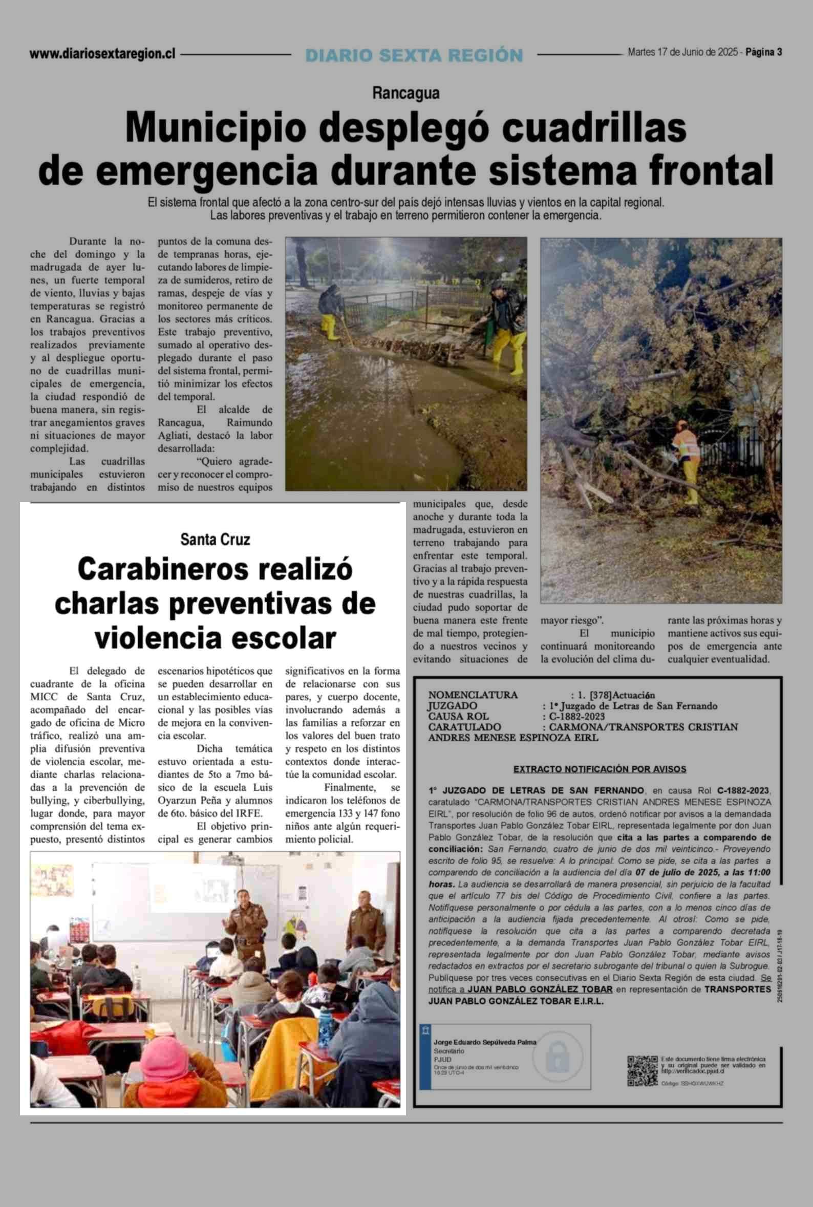 | Fecha: | 17-06-2025 | Sector: | Noticia general | Región: | Región del Libertador General Bernardo O'Higgins |