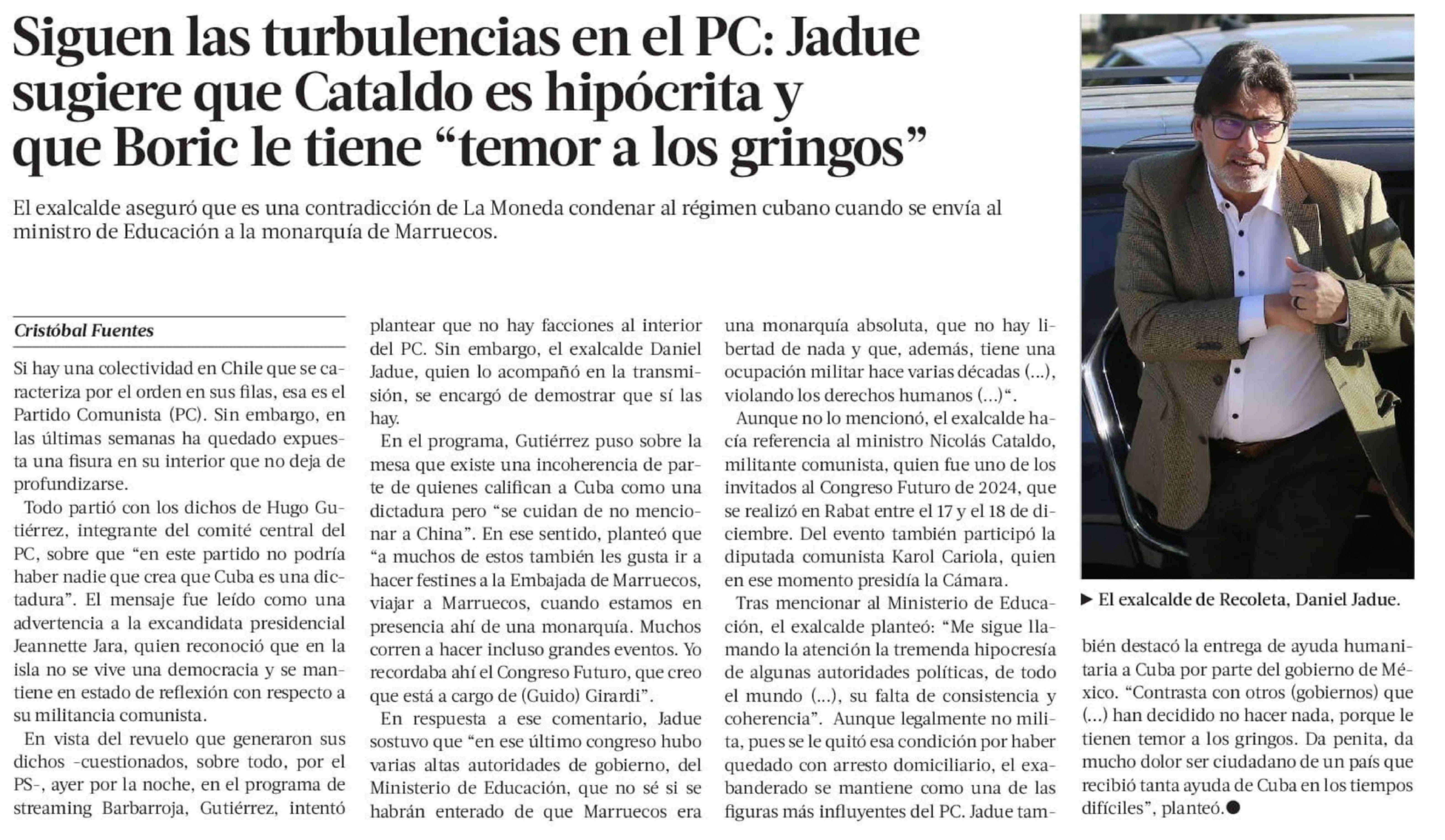 Título: Siguen las turbulencias en el PC: Jadue sugiere que Cataldo es hipócrita y que Boric le tiene "temor a los gringos"
