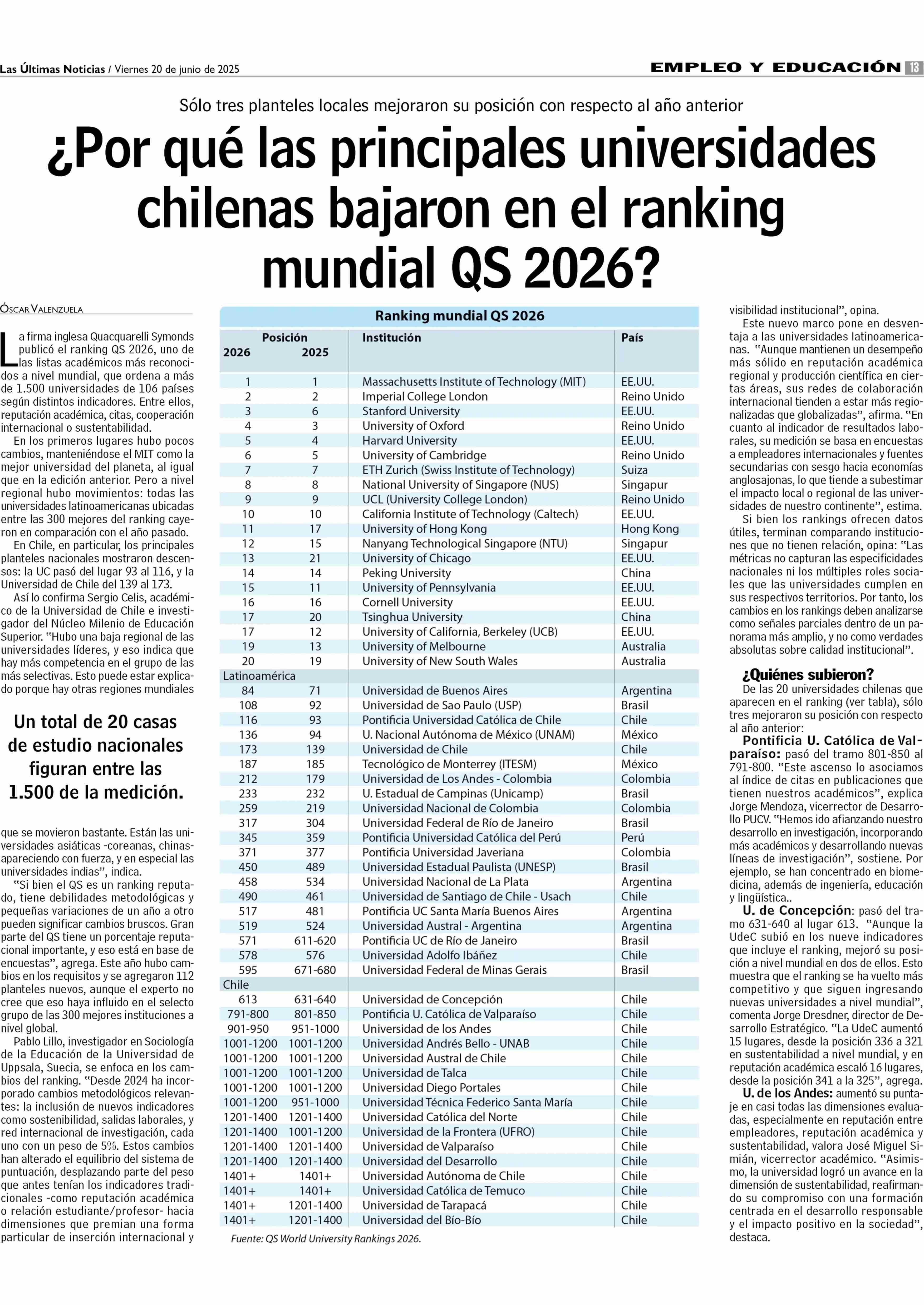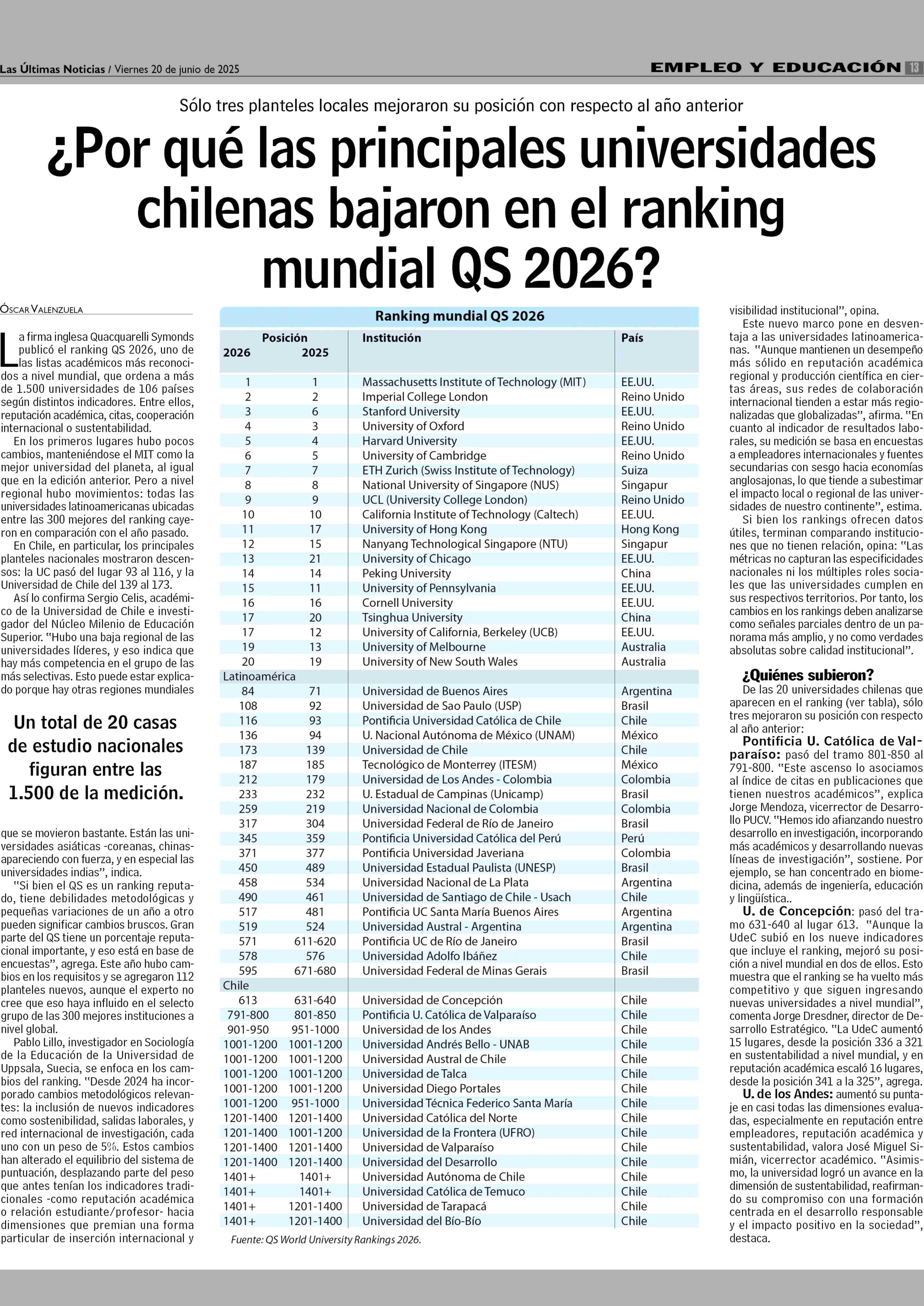 ¿Por qué las principales universidades chilenas bajaron en el ranking mundial QS 2026? 20-06-2025 Las Últimas Noticias |