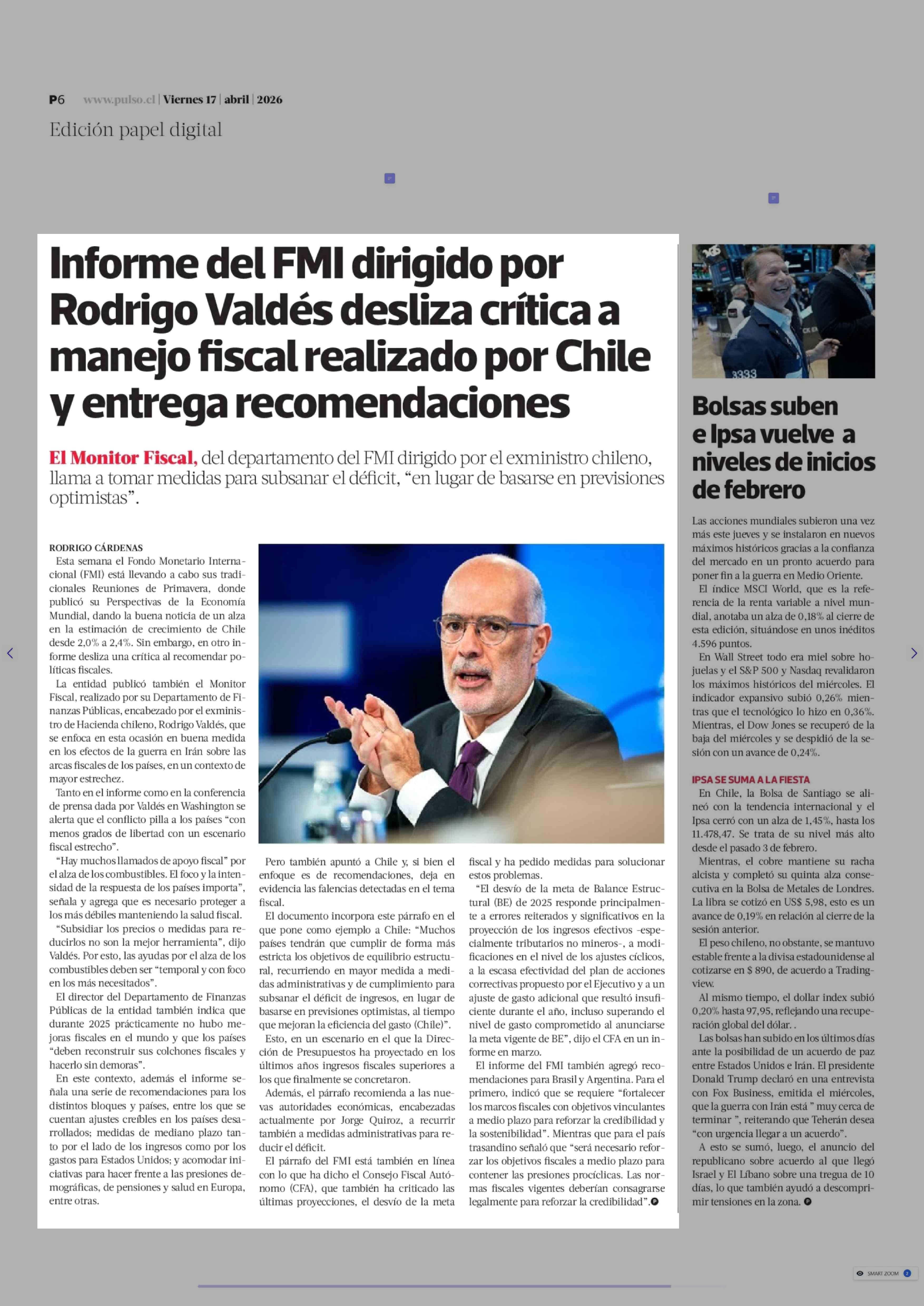 Informe del FMI dirigido por Rodrigo Valdés desliza crítica a manejo fiscal realizado por Chile y entrega recomendaciones 17-04-2026 La Tercera |