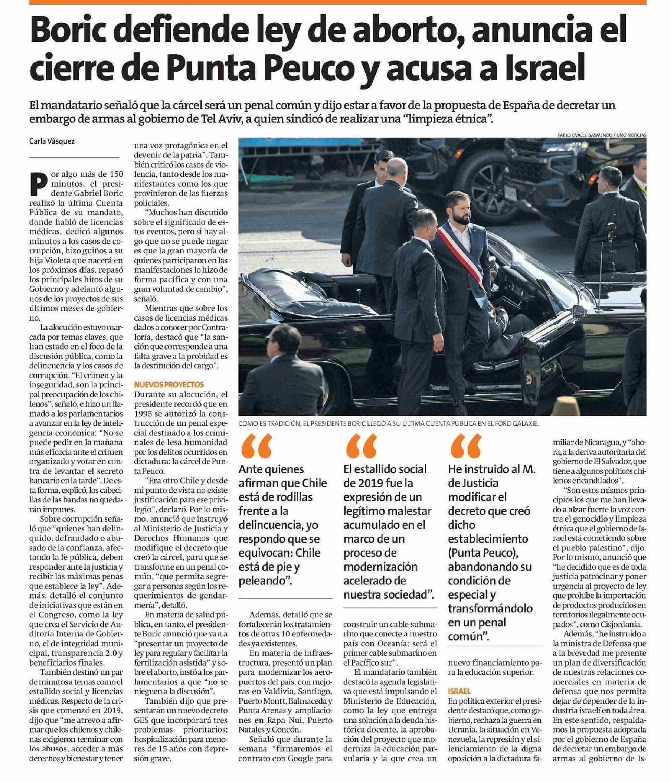 Boric defiende ley de aborto, anuncia el cierre de Punta Peuco y acusa a Israel 02-06-2025 La Estrella de Arica |