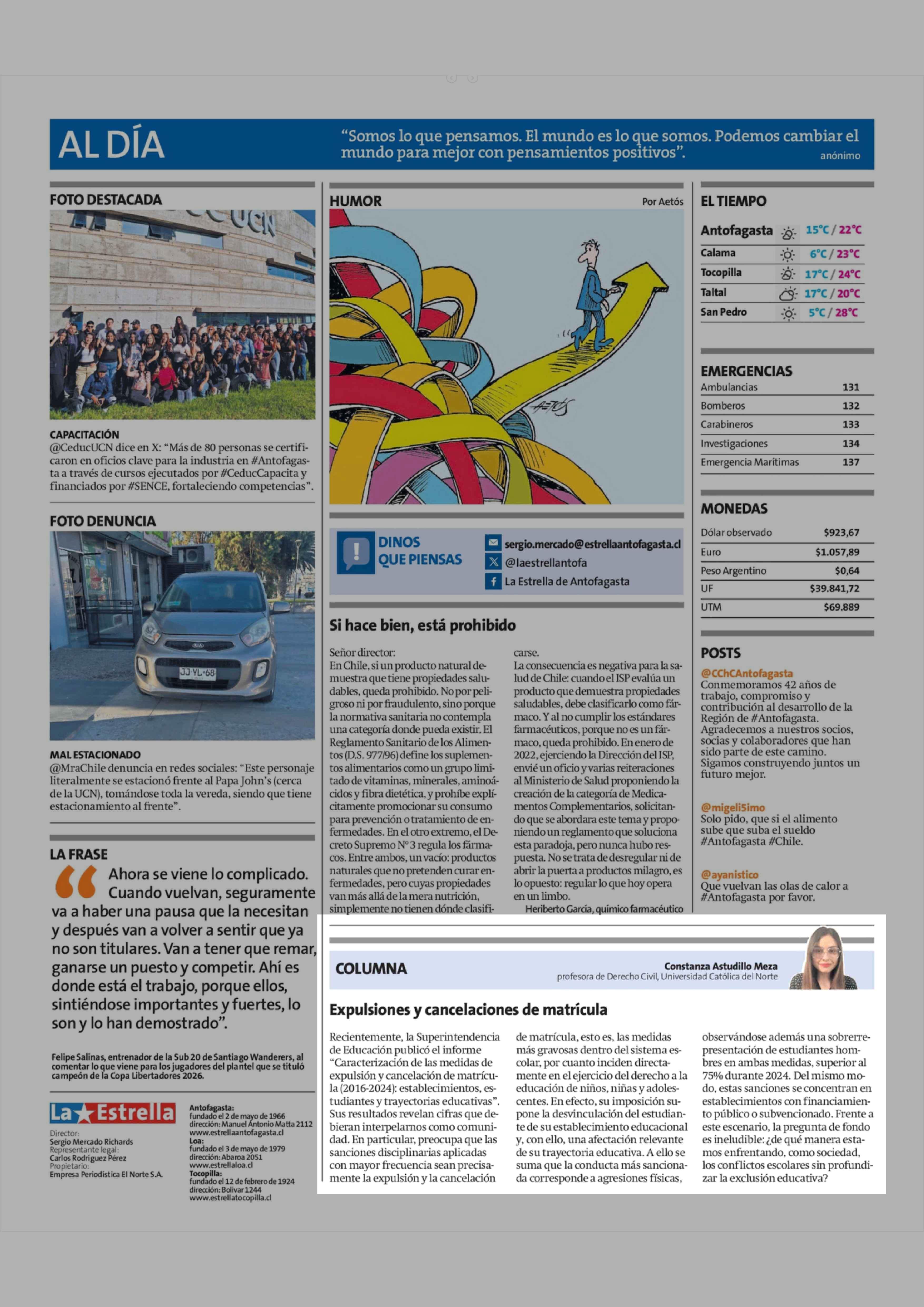 Columnas de Opinión: Expulsiones y cancelaciones de matrícula 24-03-2026 La Estrella de Antofagasta |