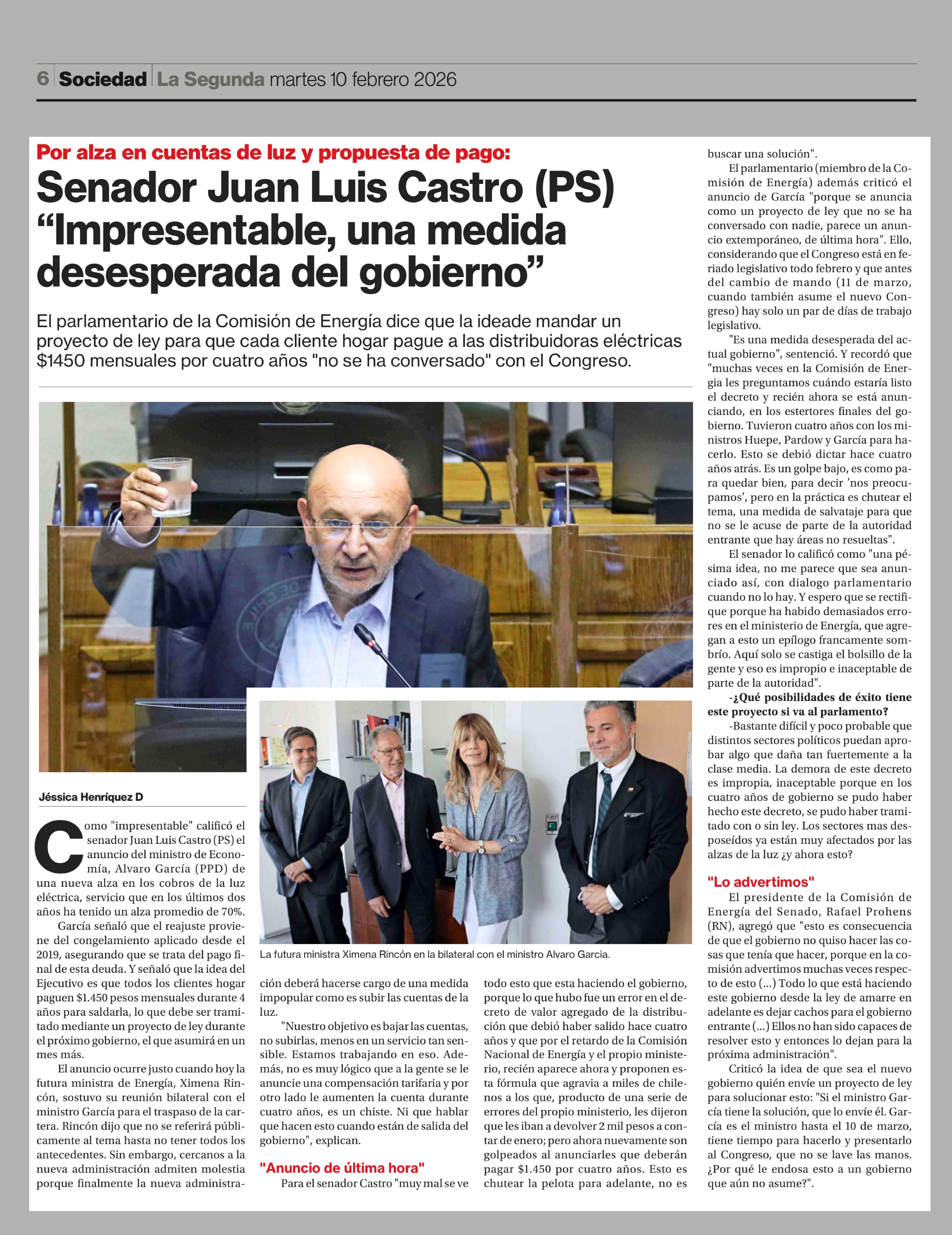 Senador Juan Luis Castro (PS) "Impresentable, una medida desesperada del gobierno" 10-02-2026 La Segunda |