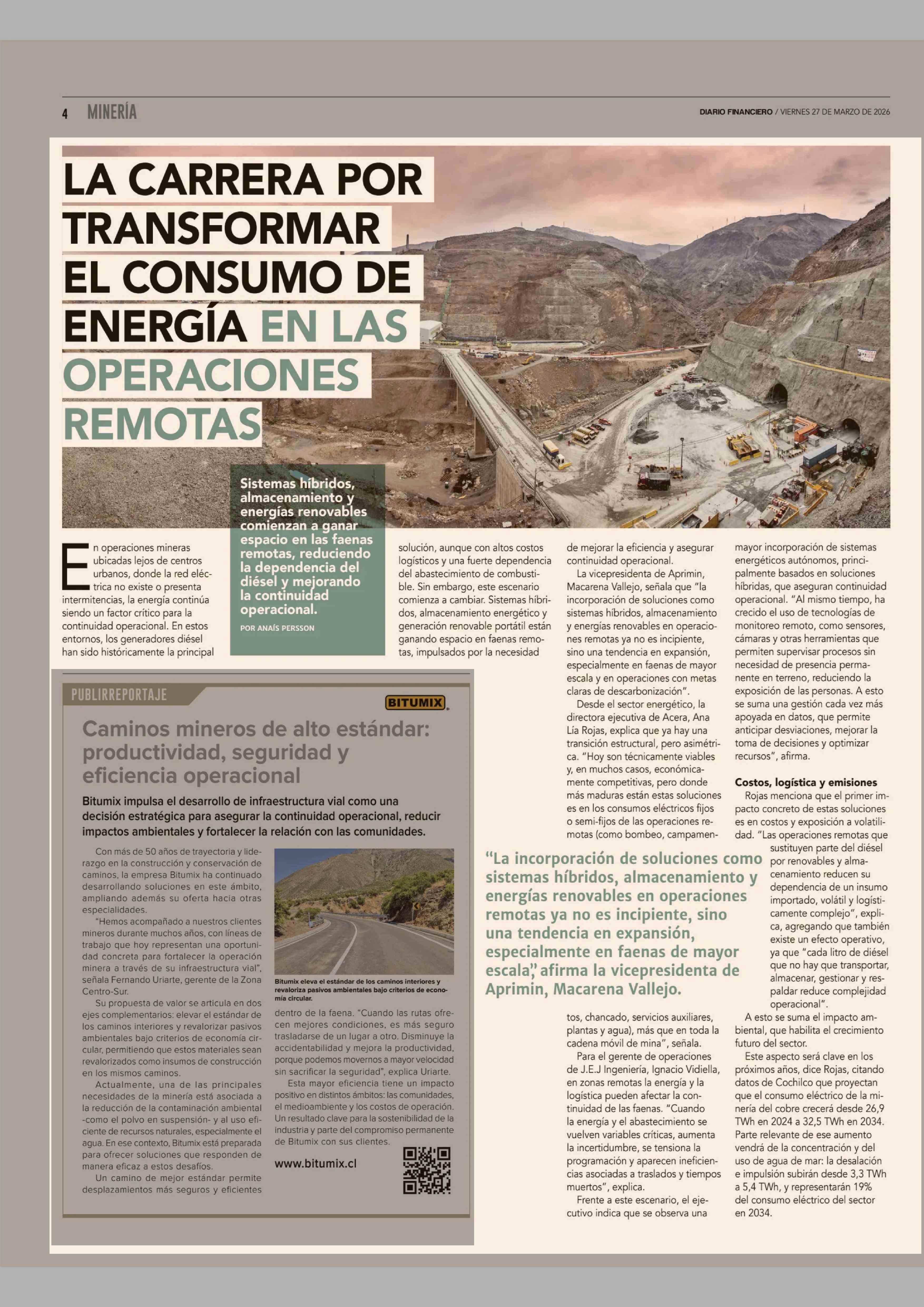 LA CARRERA POR TRANSFORMAR EL CONSUMÓ DE ENERGÍA EN LAS OPERACIONES REMOTAS 27-03-2026 Diario Financiero |