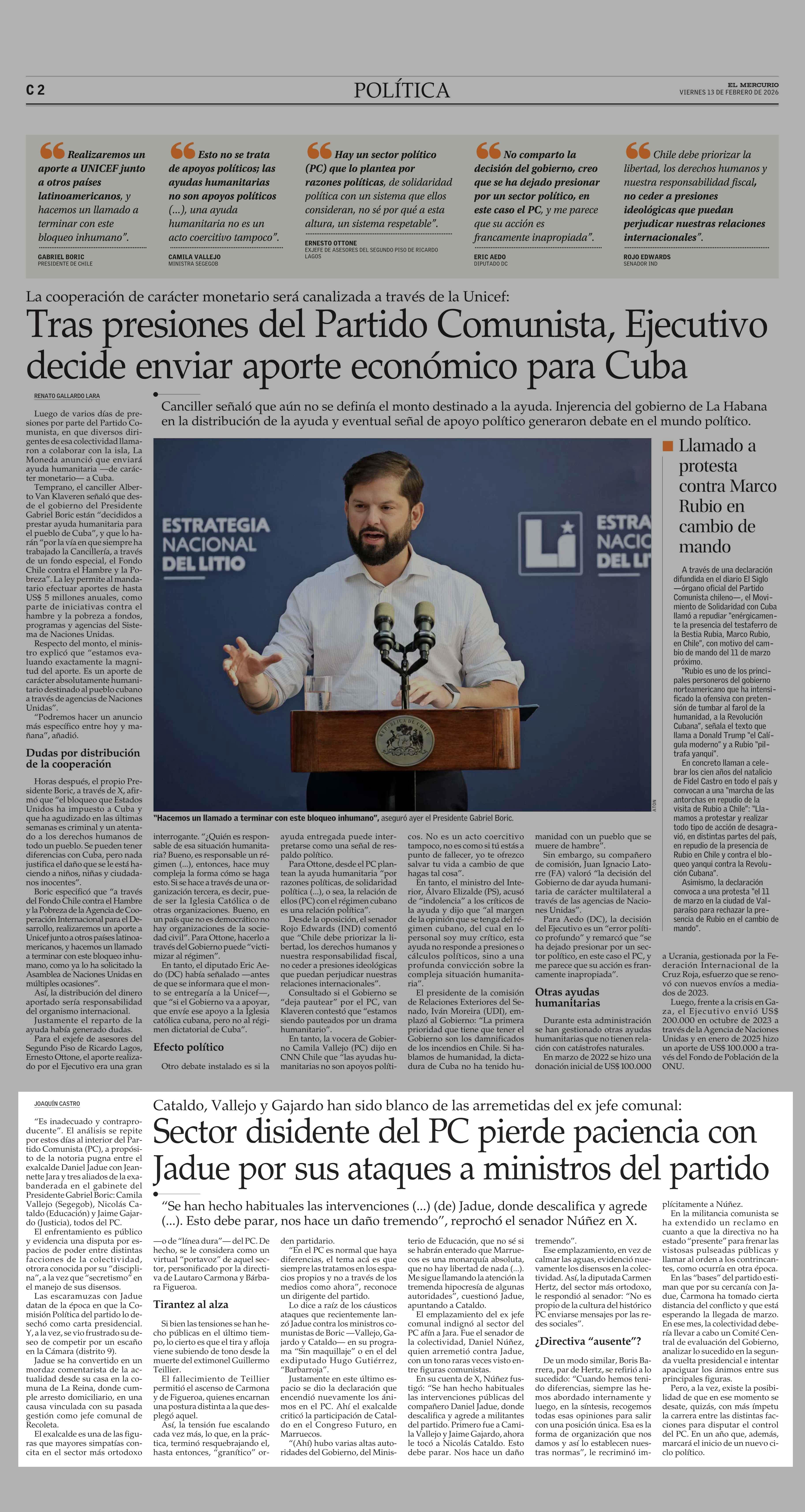 Sector disidente del PC pierde paciencia con Jadue por sus ataques a ministros del partido 13-02-2026 El Mercurio |