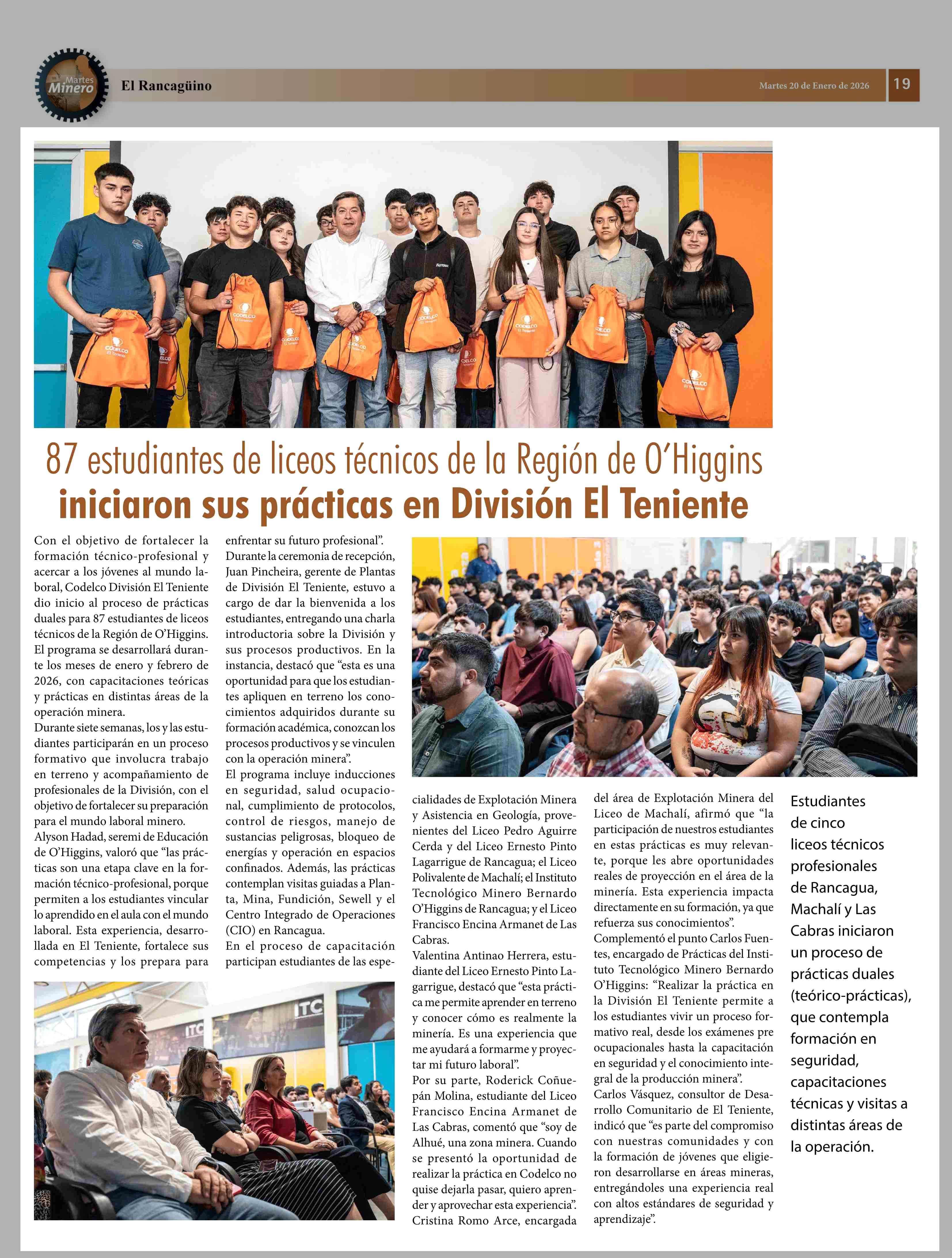 87 Estudiantes de liceos técnicos de la Región de O'Higgins iniciaron sus prácticas en División El Teniente 20-01-2026 El Rancagüino |