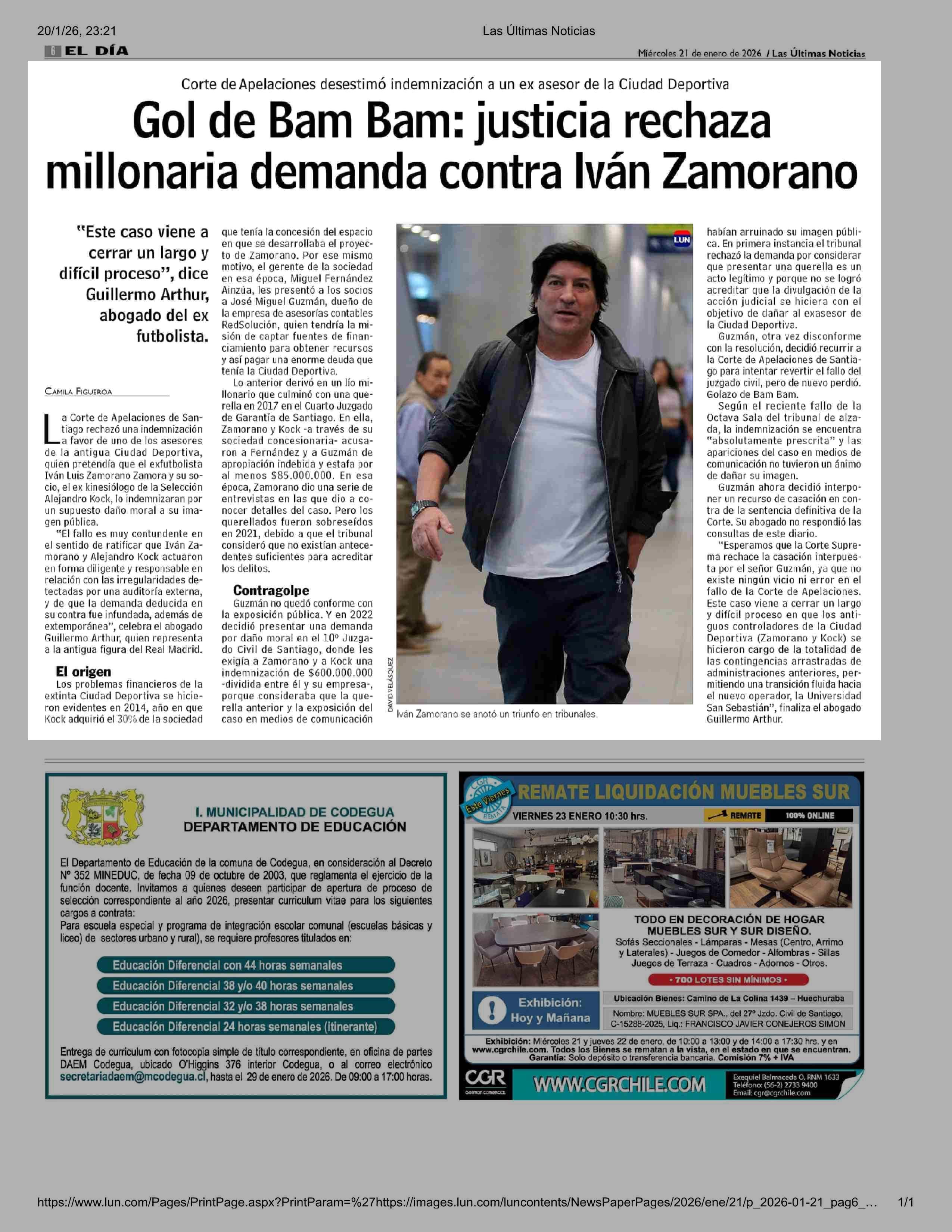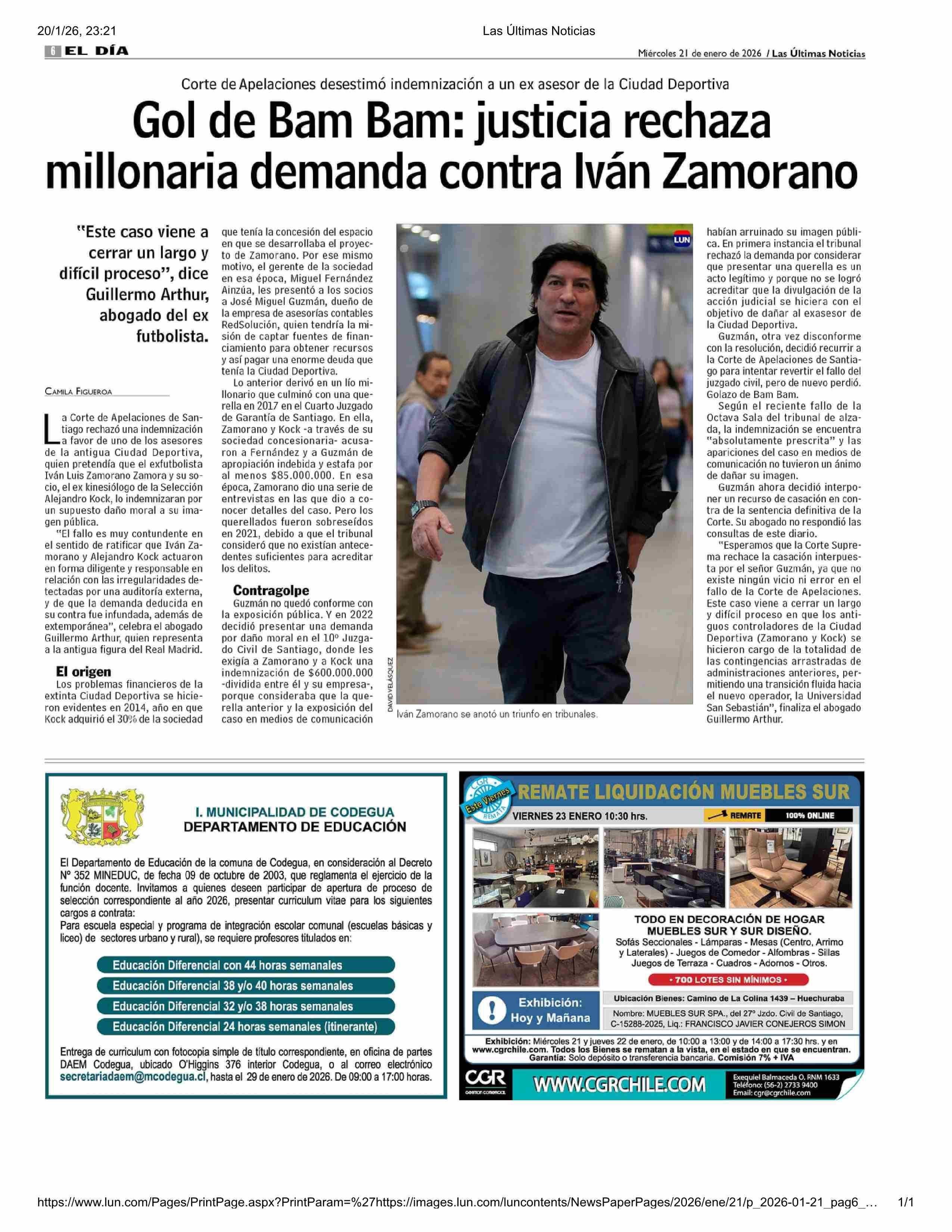 Gol de Bam Bam: justicia rechaza millonaria demanda contra Iván Zamorano 21-01-2026 Las Últimas Noticias |