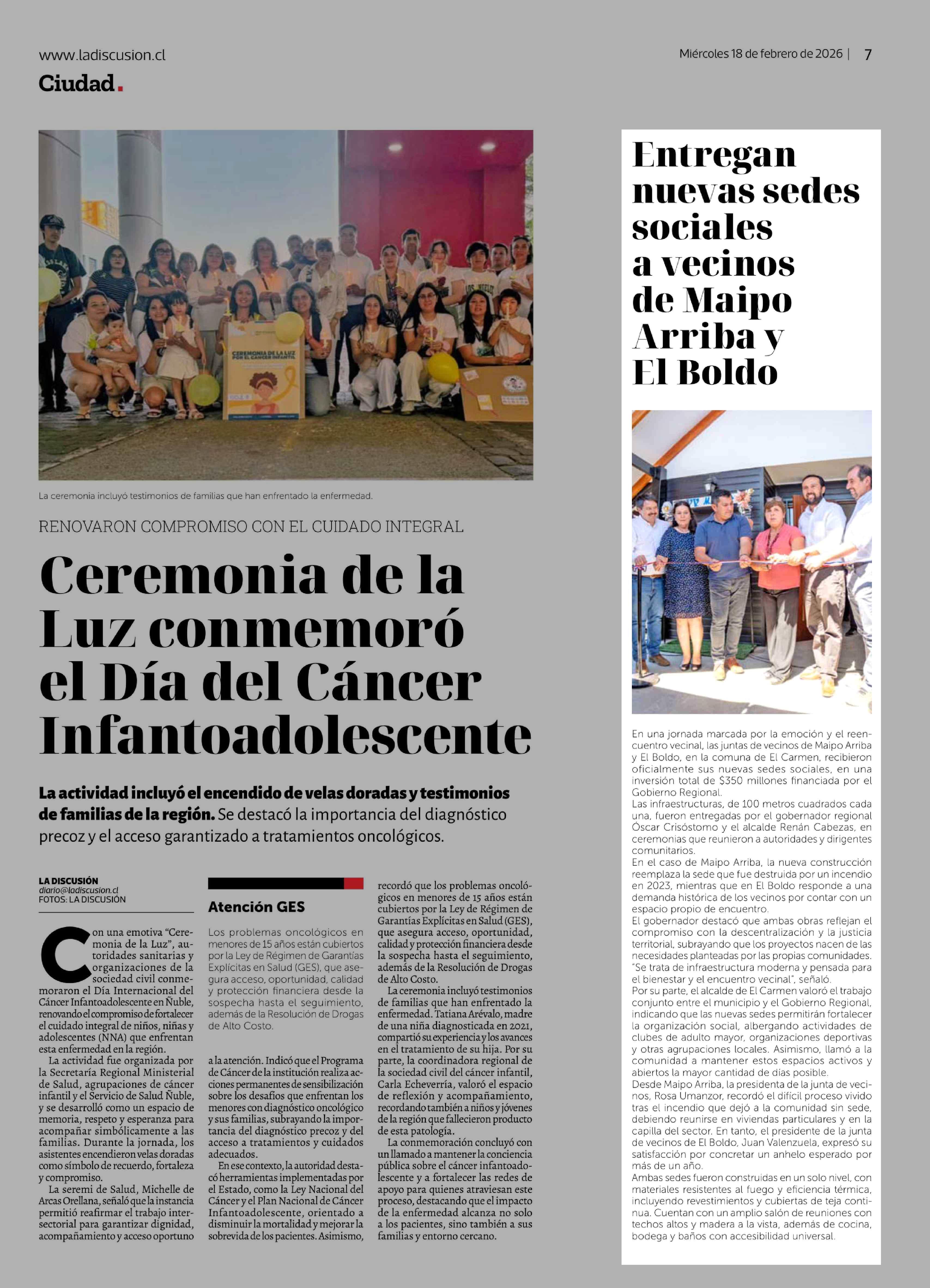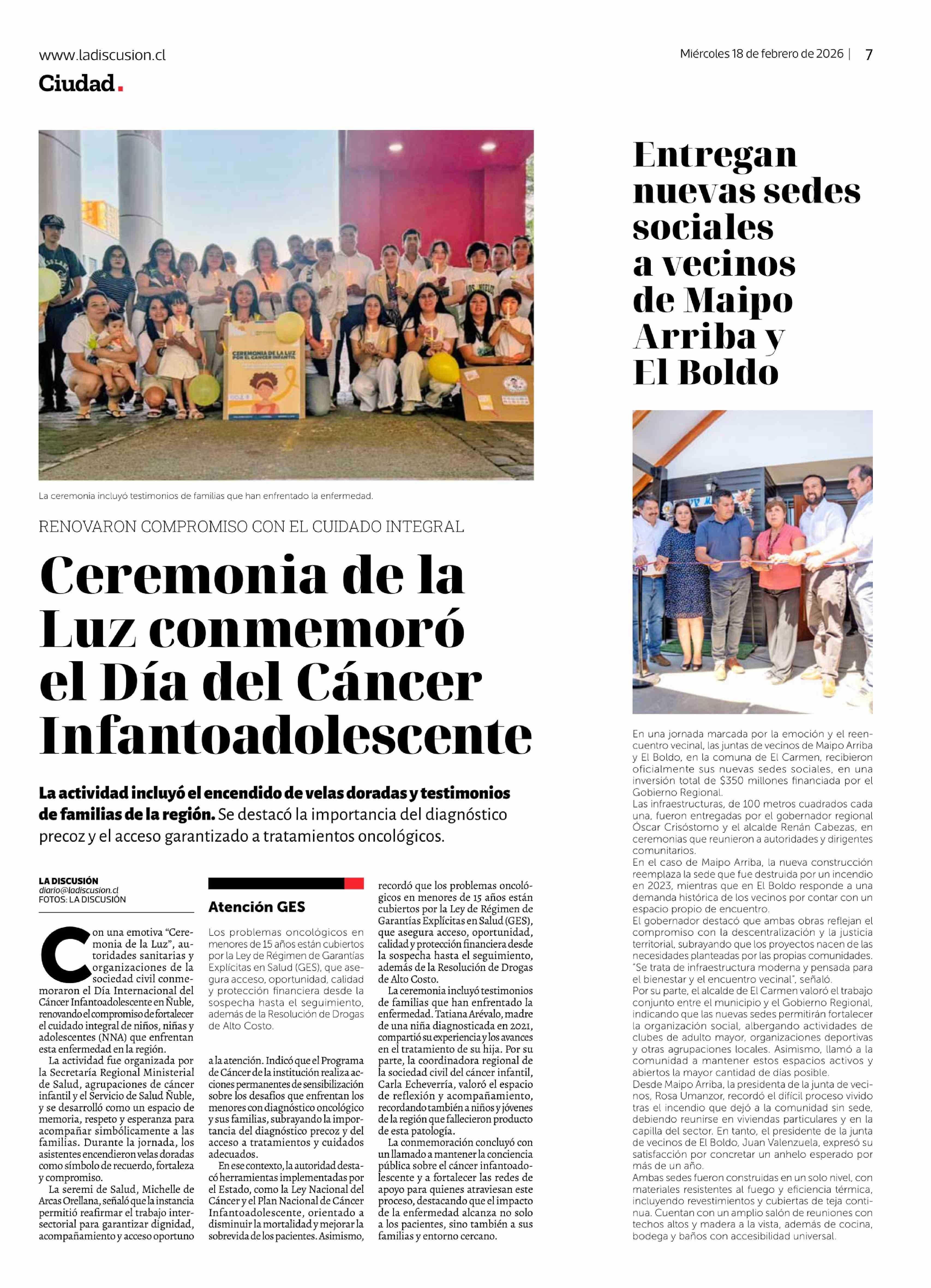 Entregan nuevas sedes sociales a vecinos de Maipo Arriba y El Boldo 18-02-2026 La Discusión |