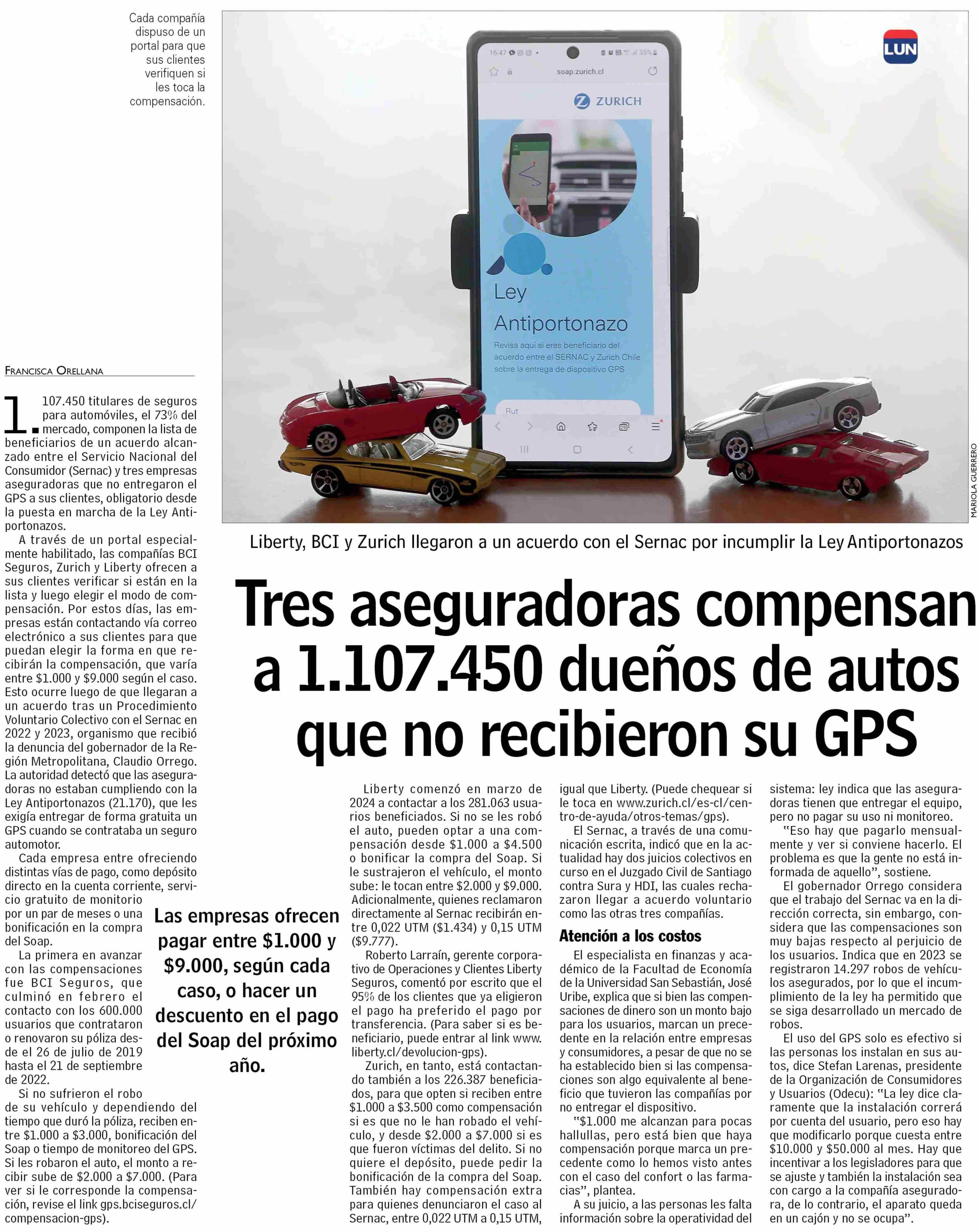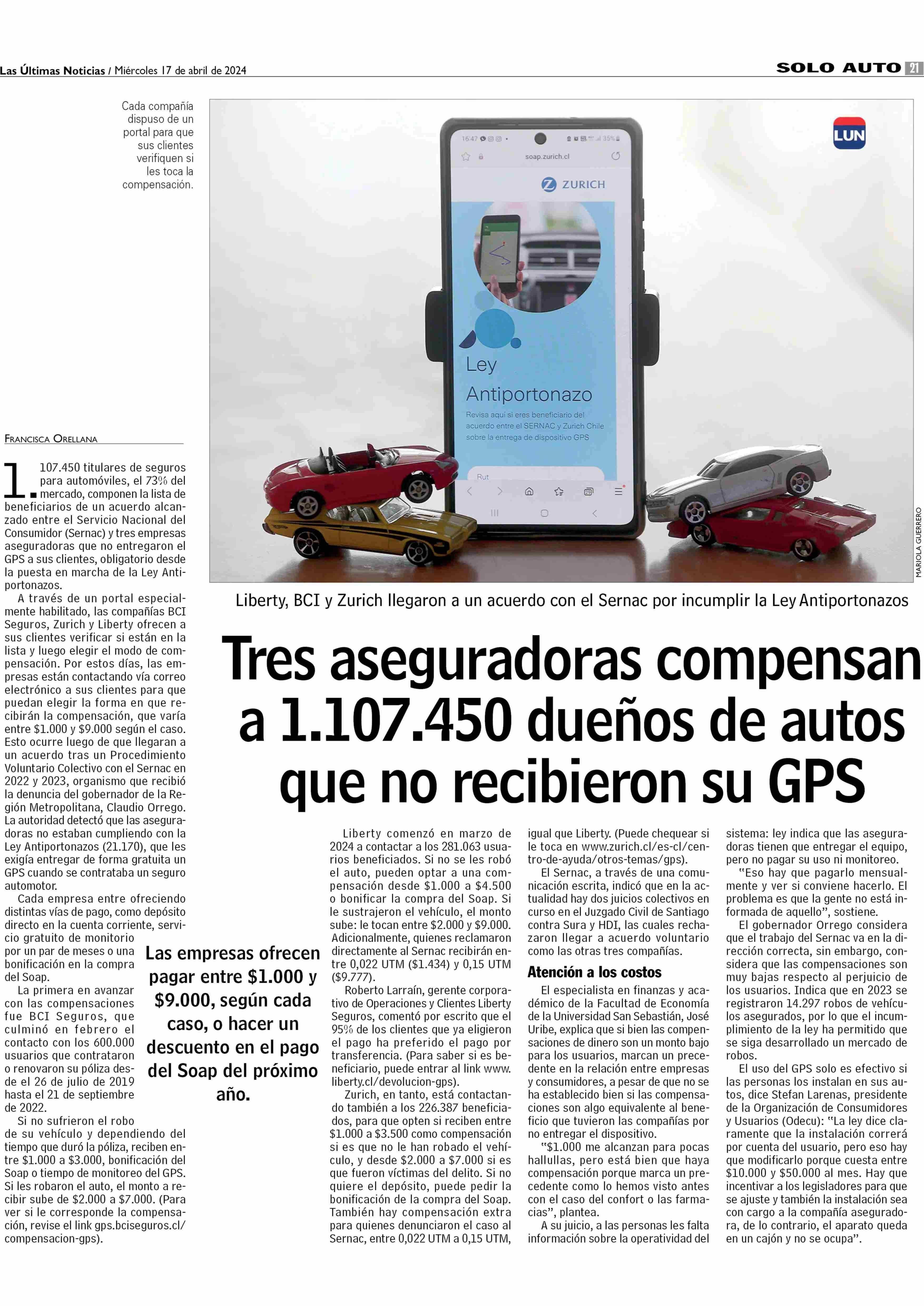 Tres aseguradoras compensan a 1.107.450 dueños de autos que no recibieron su GPS 17-04-2024 Las Últimas Noticias |