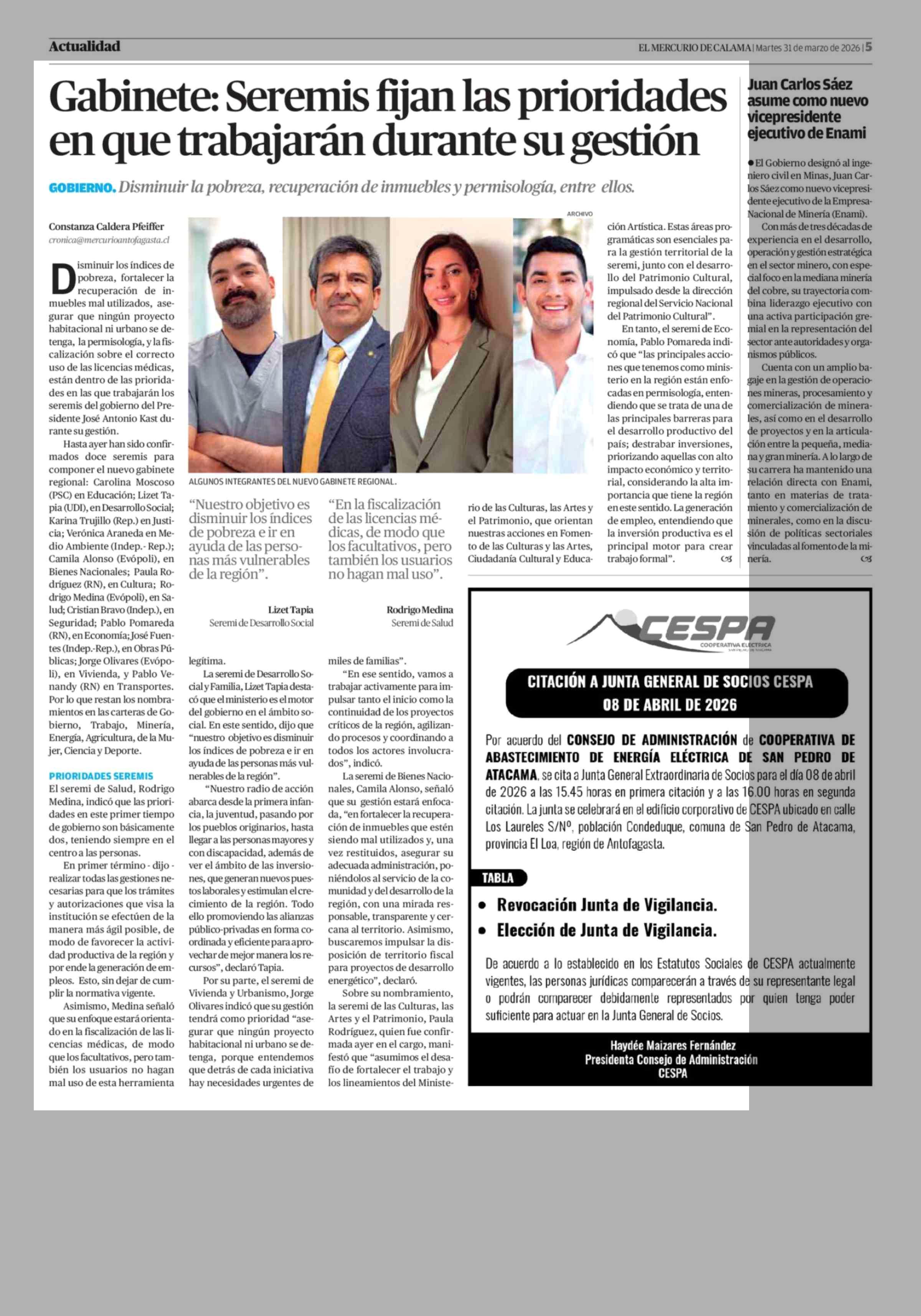 Gabinete: Seremis fijan las prioridades en que trabajarán durante su gestión 31-03-2026 El Mercurio de Calama |