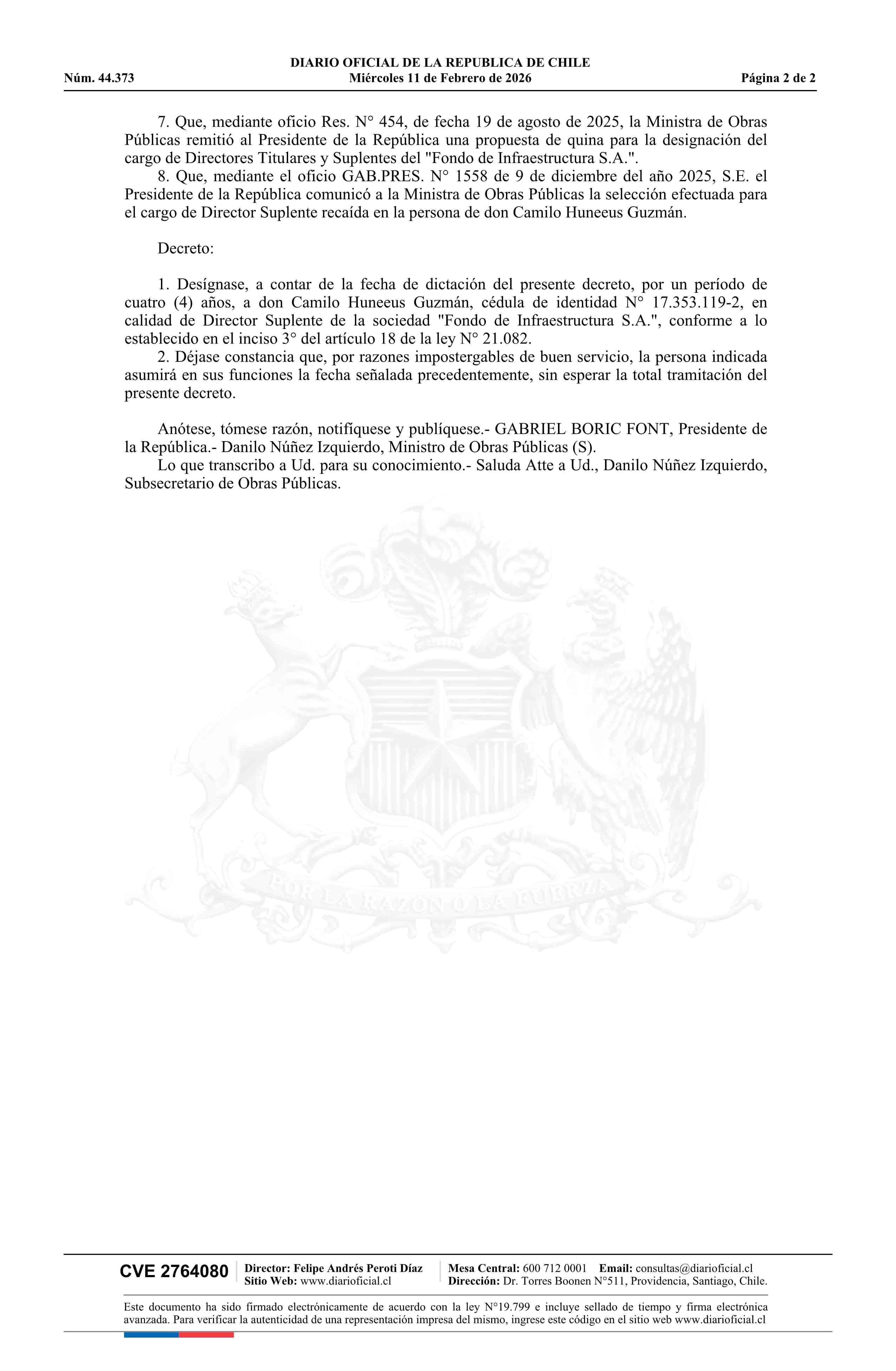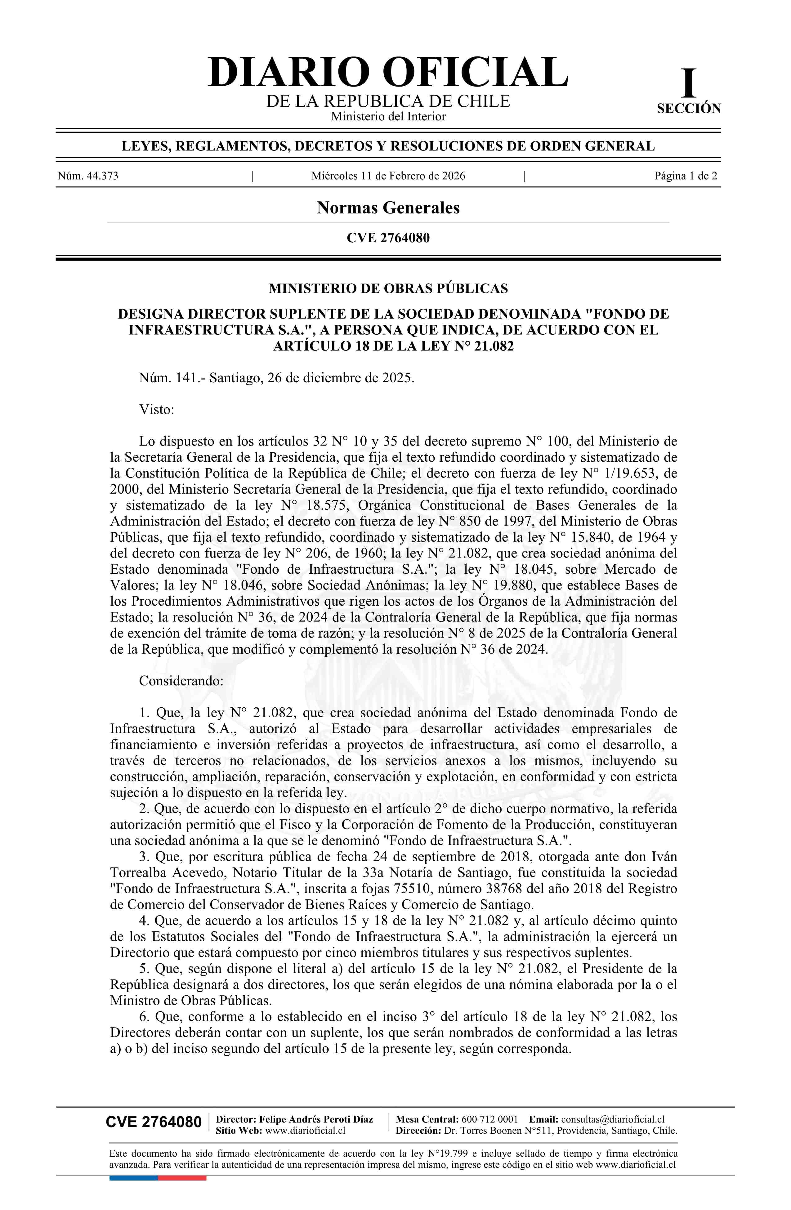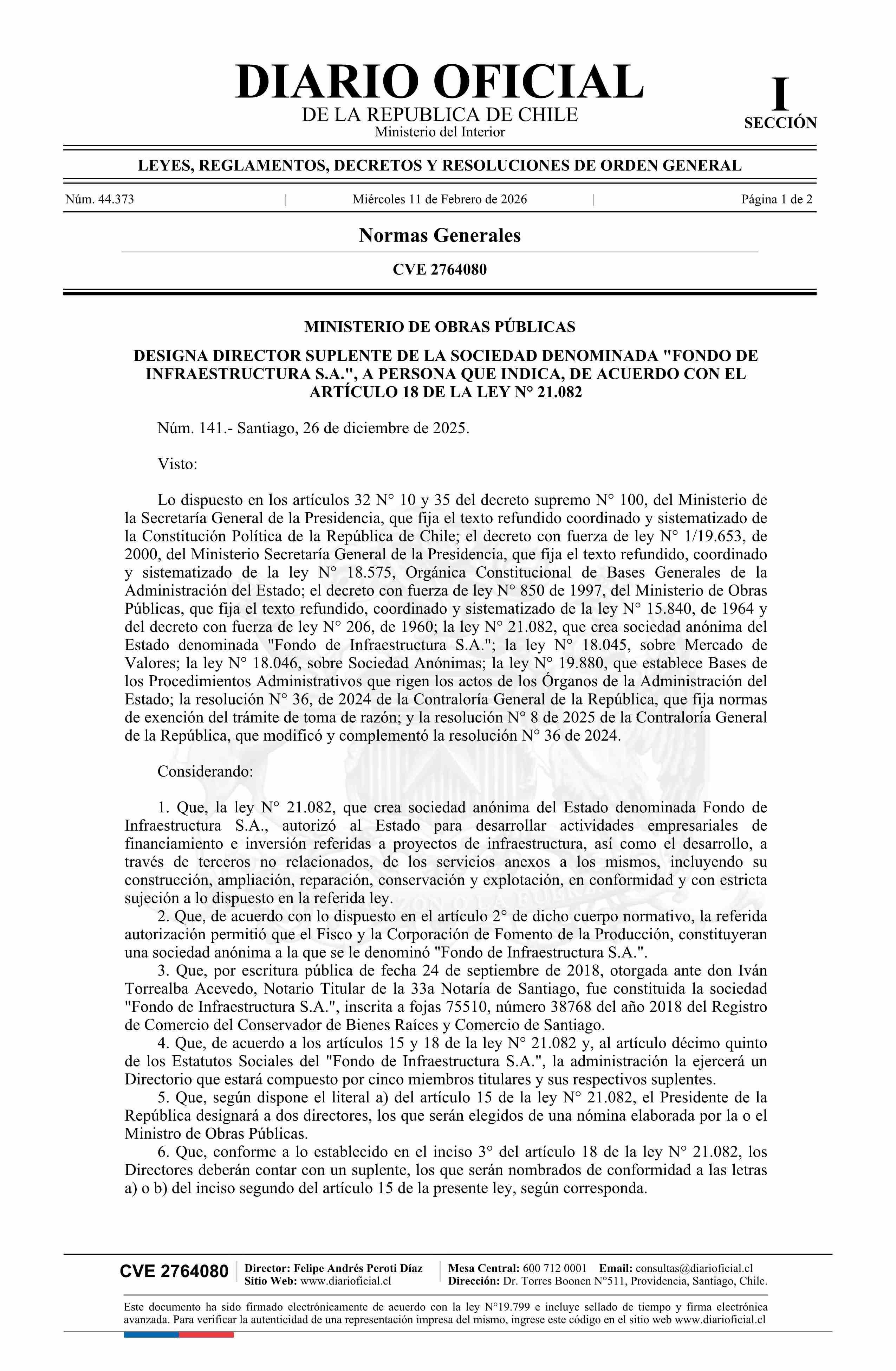 Título: Decreto número 141, de 2025.- Designa Director Suplente de la Sociedad denominada Fondo de Infraestructura S.A., a persona que indica, de acuerdo con el artículo 18 de la ley N° 21.082