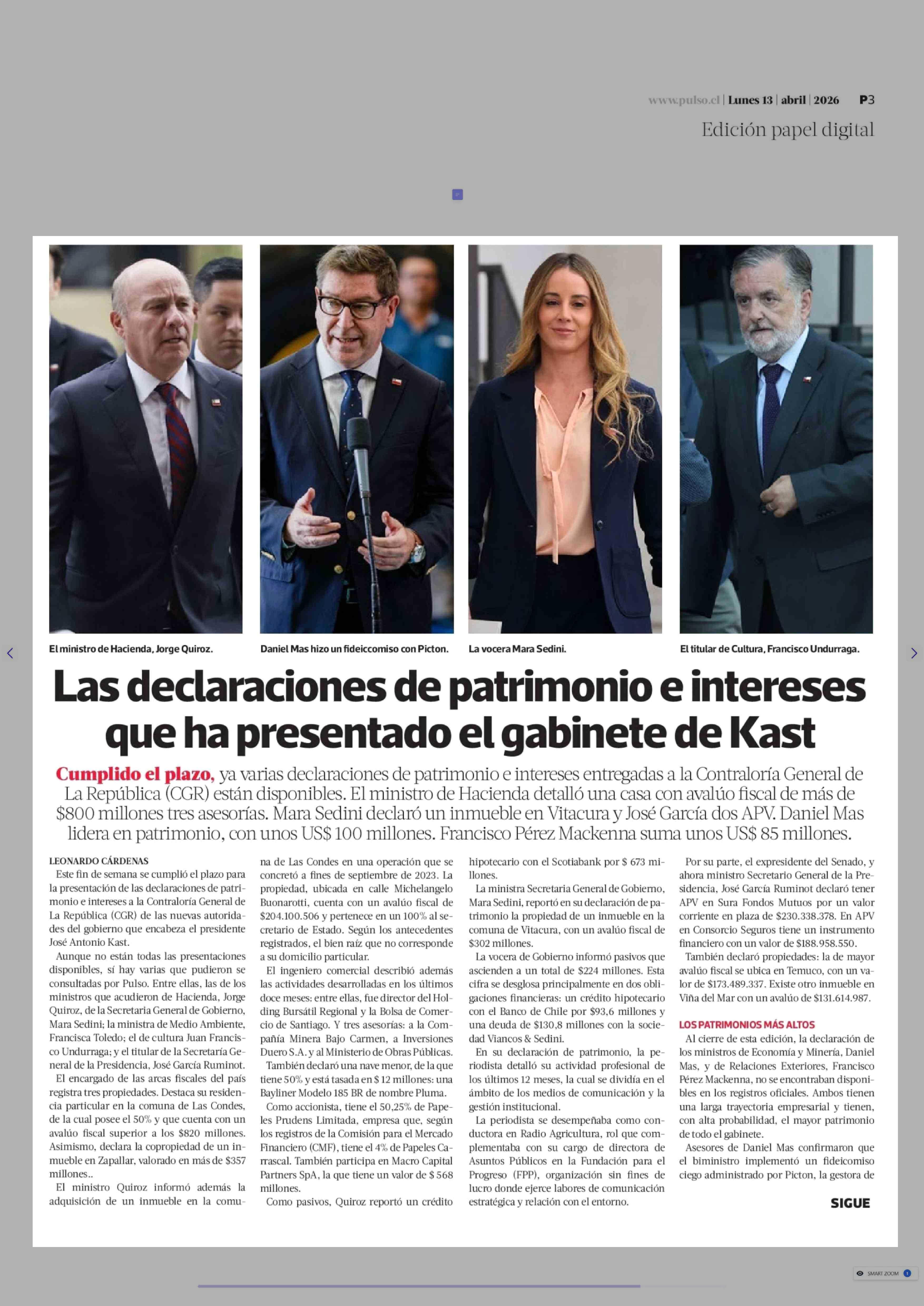 Las declaraciones de patrimonio e intereses que ha presentado el gabinete de Kast 13-04-2026 La Tercera |