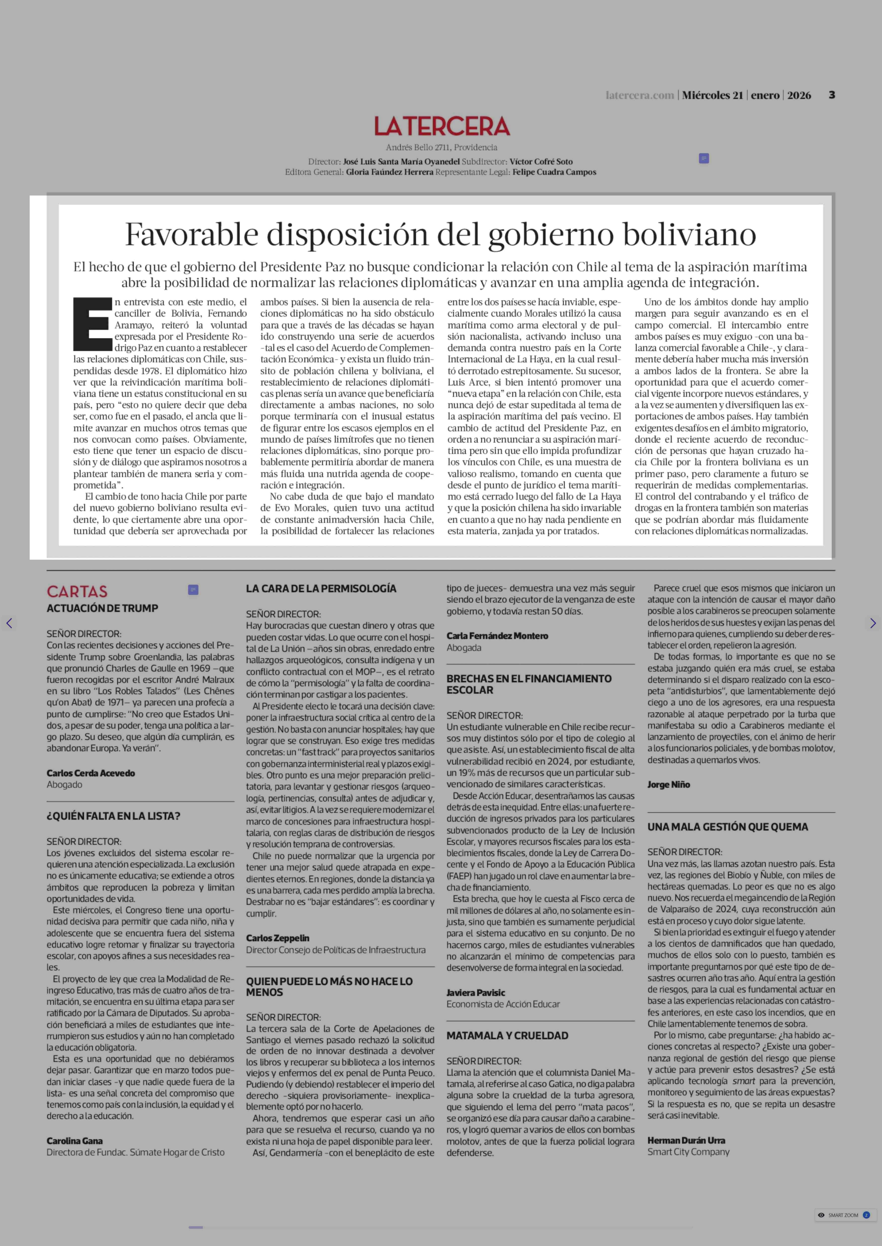 EDITORIAL: Favorable disposición del gobierno boliviano 21-01-2026 La Tercera |