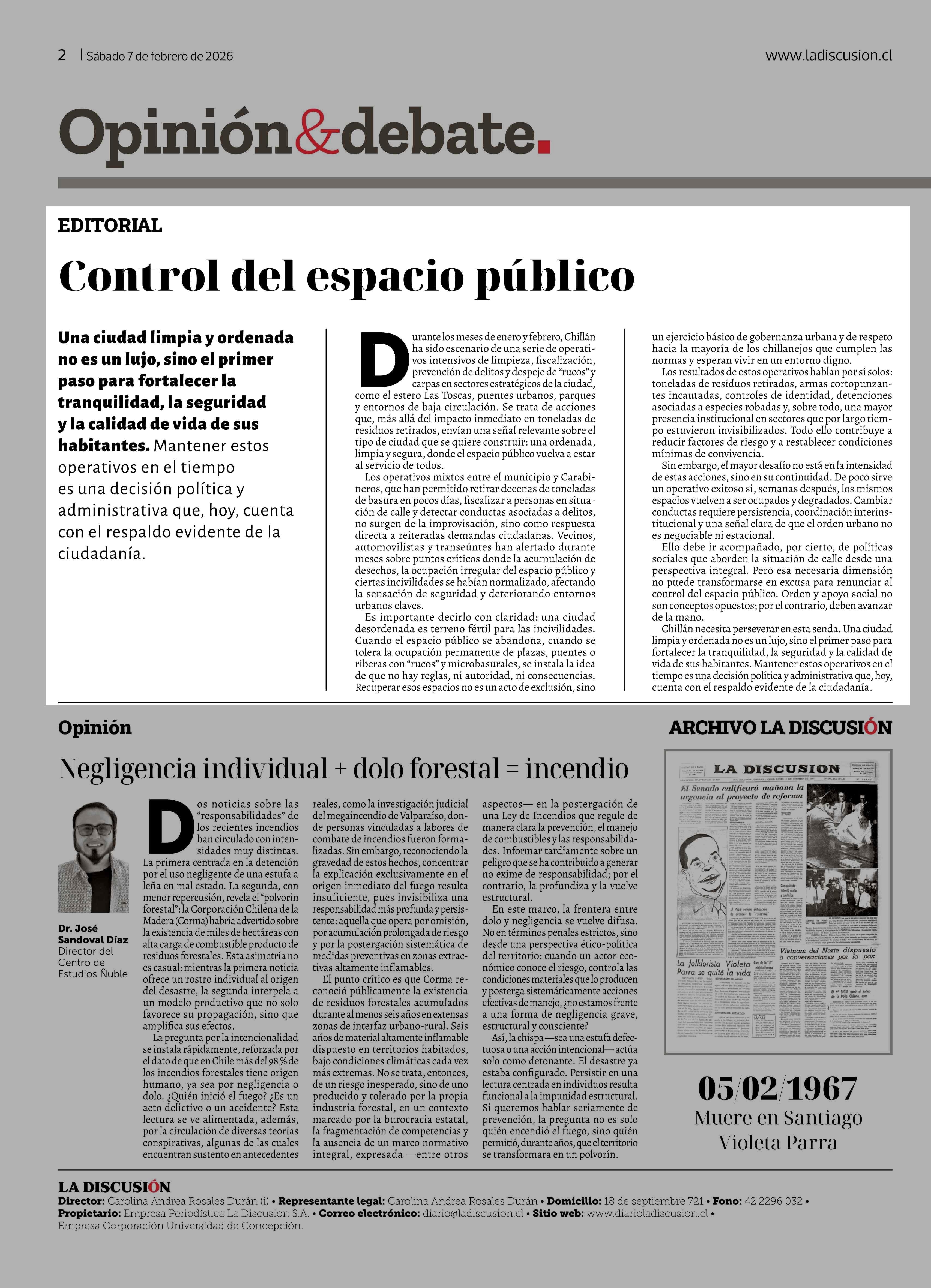 Editorial: Control del espacio público 07-02-2026 La Discusión |