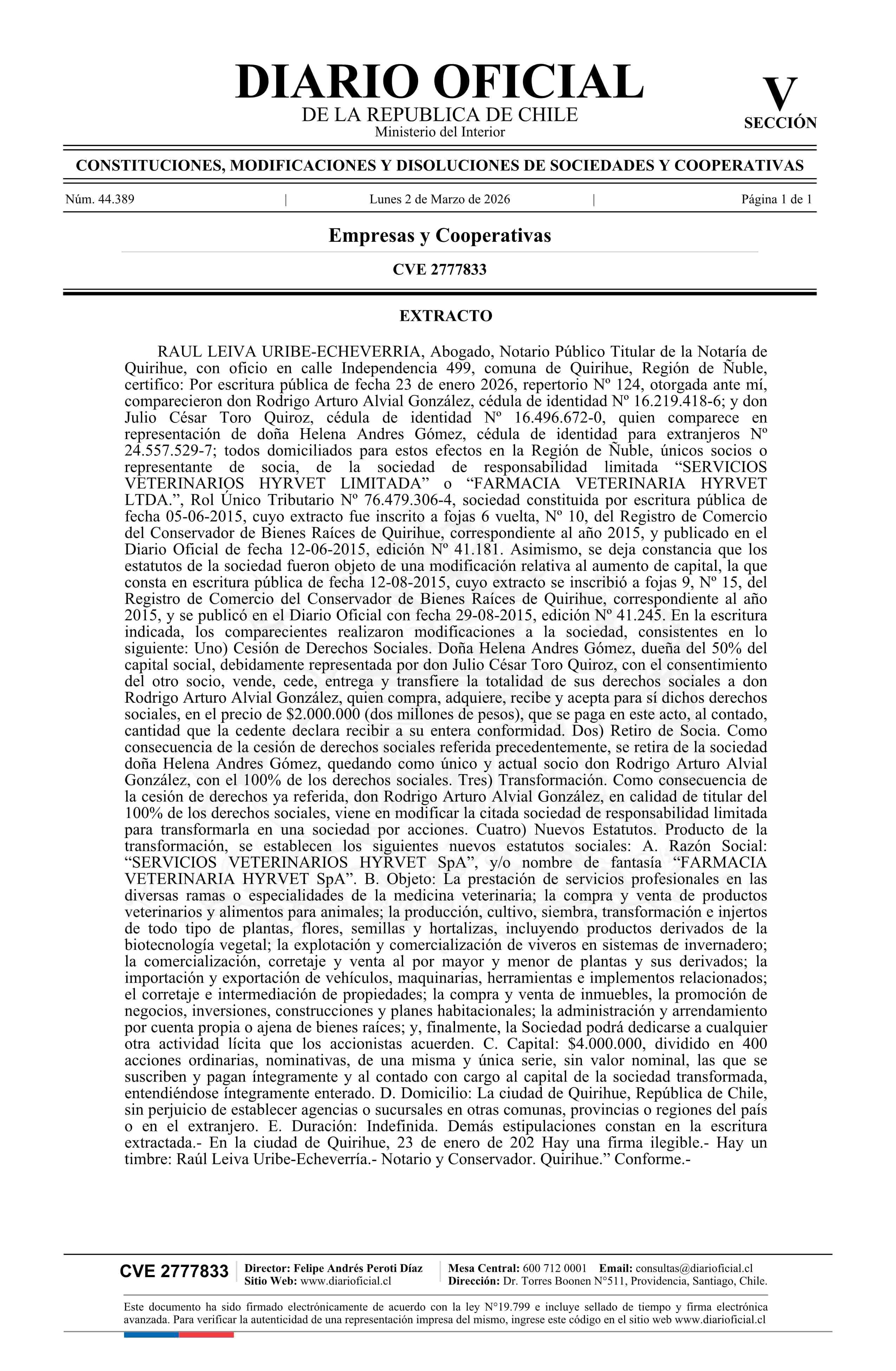 Título: SERVICIOS VETERINARIOS HYRVET LIMITADA 76.479.306-4*