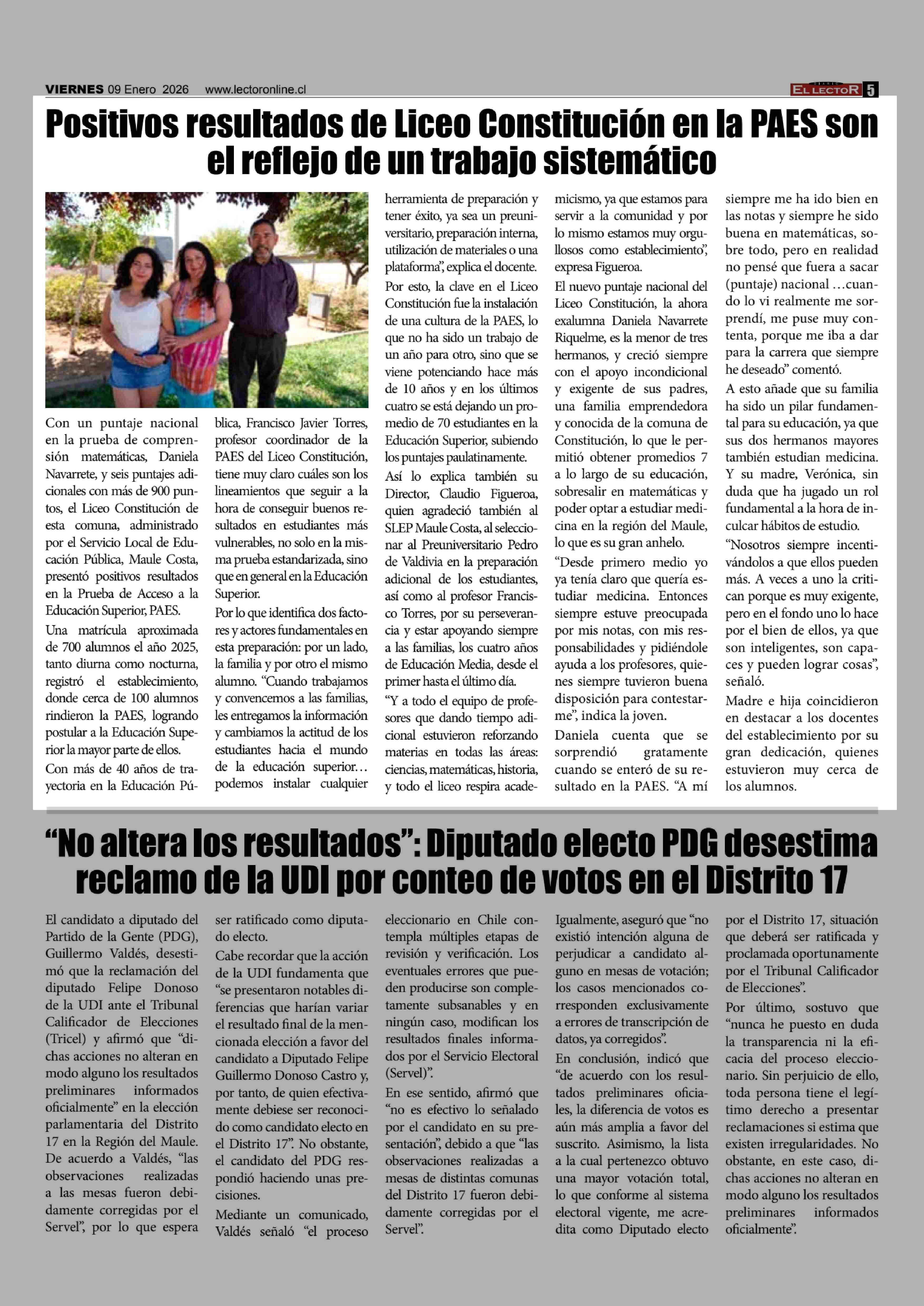 Positivos resultados de Liceo Constitución en la PAES son el reflejo de un trabajo sistemático 09-01-2026 El Lector |