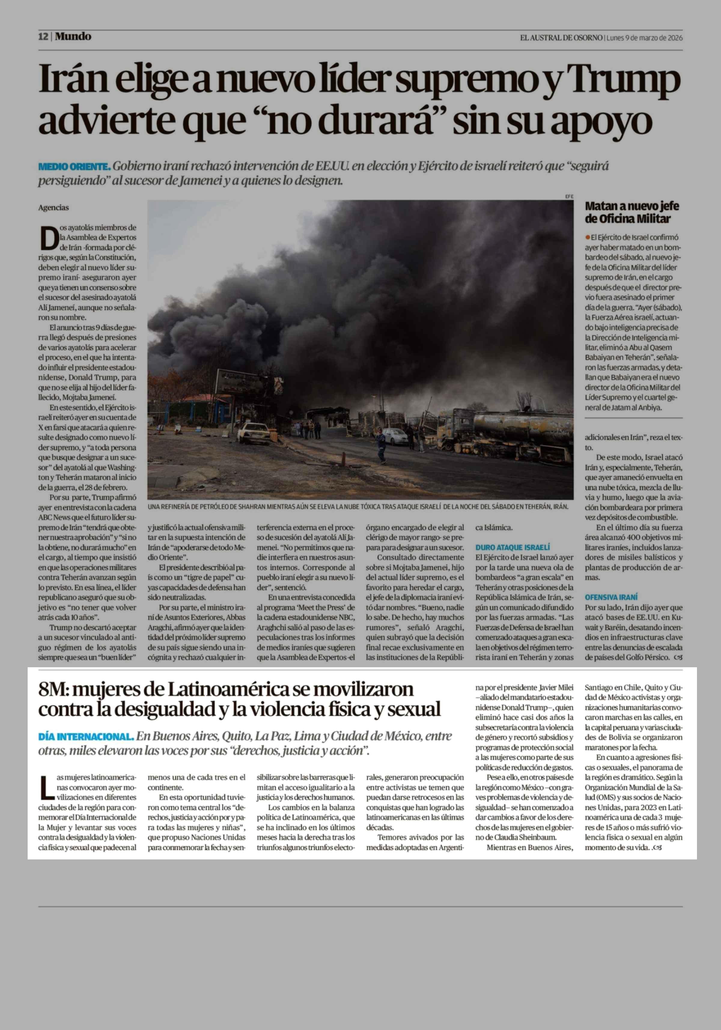 8M: mujeres de Latinoamérica se movilizaron contra la desigualdad y la violencia fisica y sexual 09-03-2026 El Austral de Osorno |